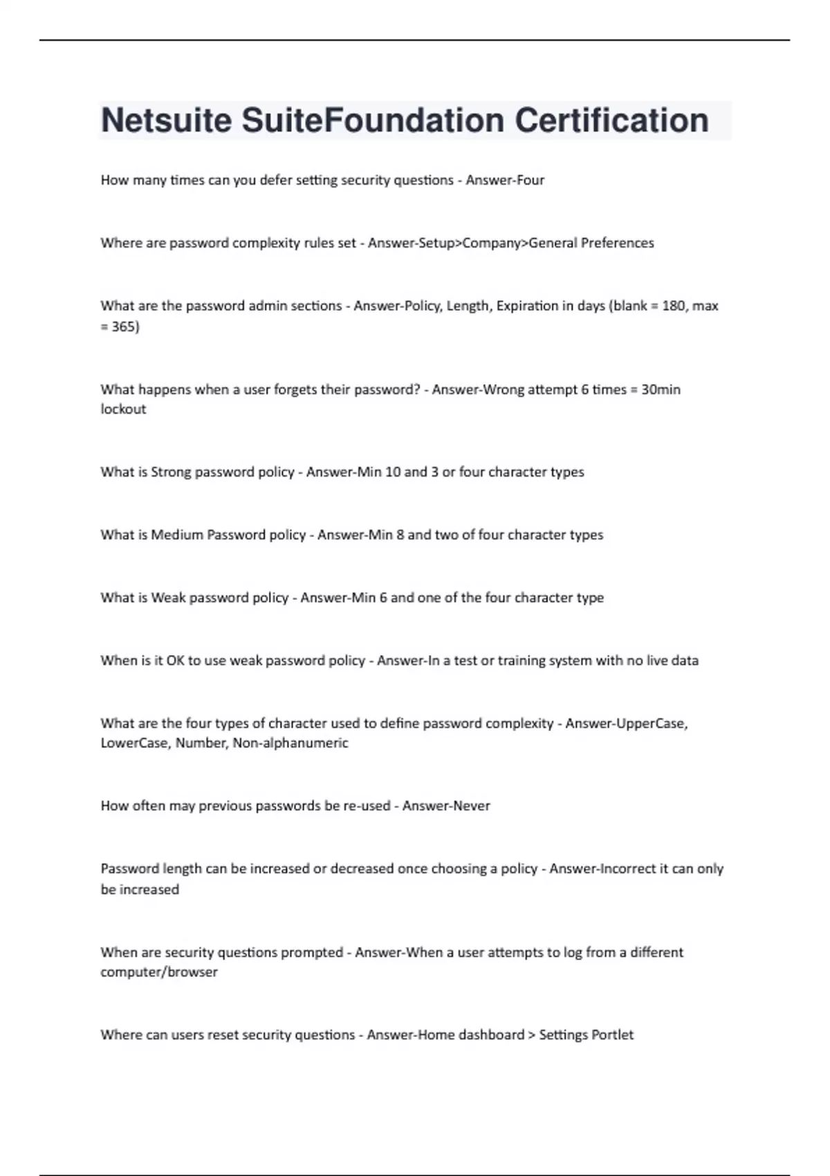 How many times can you defer setting security questions - Answer-Four Where are password complexity rules set - Answer-Setup>Company>General Preferences What are the password admin sections - Answer-Policy, Length, Expiration in days (blank = 180, max = 365) What happens when a user forgets their password? - Answer-Wrong attempt 6 times = 30min lockout What is Strong password policy - Answer-Min 10 and 3 or four character types What is Medium Password policy - Answer-Min 8 and two of four character types What is Weak password policy - Answer-Min 6 and one of the four character type When is it OK to use weak password policy - Answer-In a test or training system with no live data What are the four types of character used to define password complexity - Answer-UpperCase, LowerCase, Number, Non-alphanumeric How often may previous passwords be re-used - Answer-Never Password length can be increased or decreased once choosing a policy - Answer-Incorrect it can only be increased When are security questions prompted - Answer-When a user attempts to log from a different computer/browser Where can users reset security questions - Answer-Home dashboard > Settings PortletWhat is a Netsuite Center - Answer-Grouping of tabs displayed across the users page What is the Classic center - Answer-The default center (interface) for Administrators What center does an Admin receive by default - Answer-The Classic center What is the difference between the classic centre and other centres - Answer-Lists/Transactions tabs are replaced by tabs that refer to the specific transaction/entities that relate to the role ie Customers, Vendors etc Can a non-Admin use the Classsic centre? - Answer-Yes but they don't get Admin rights, simply the classic tabs for navigation. How is a portlet setup/edited - Answer-Clicking Top-Right on the three bars > Setup Where can a user determine the version of Netsuite being used - Answer-Bottom of the screen e.g. 2018.1 (Q1/Q3 releases each year) Where can a user change their password - Answer-Settings portlet (user must meet security criteria)