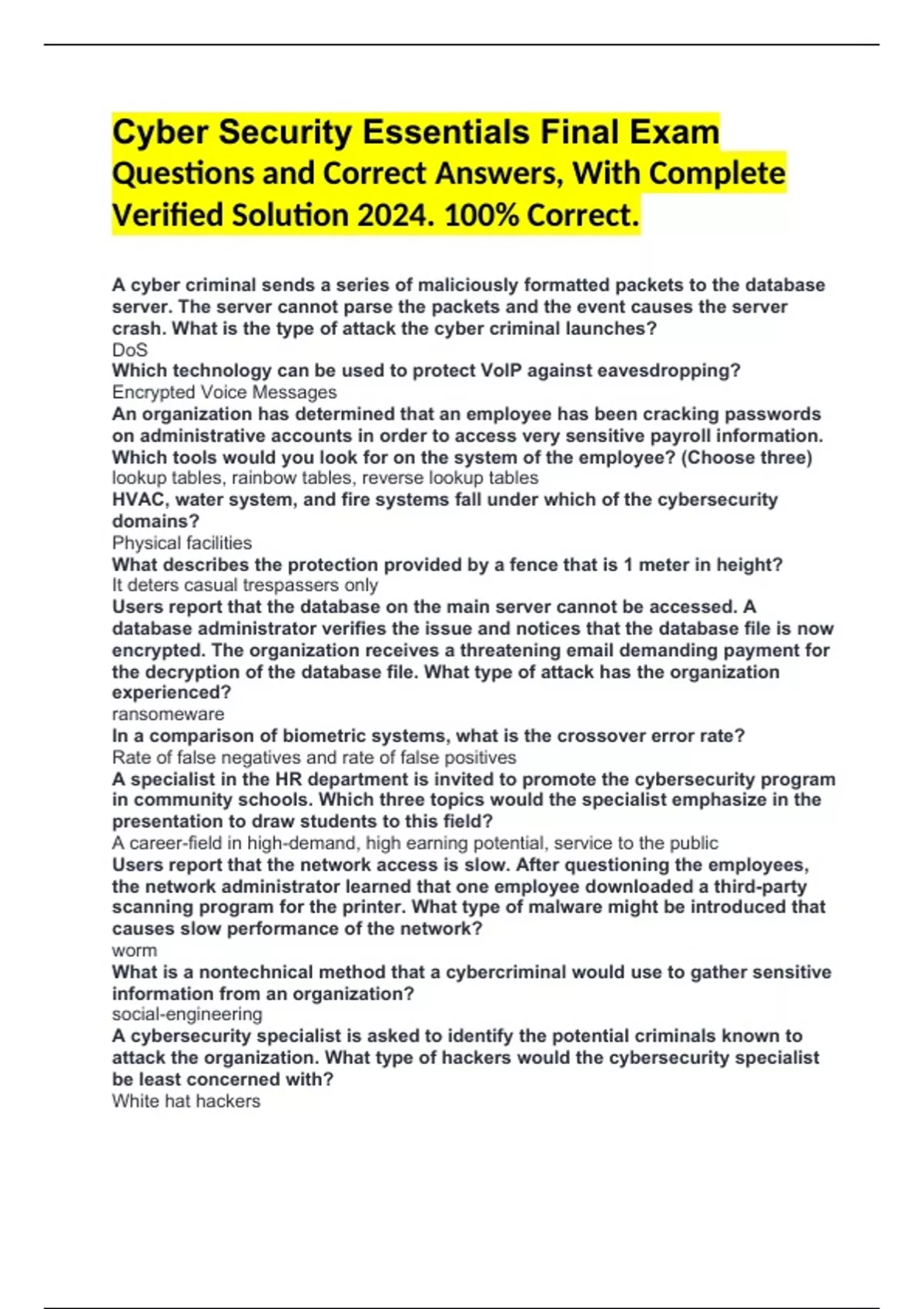 Cyber Security Essentials Final Exam Questions and Correct Answers, With Complete Verified Solution 2024. 100% Correct.