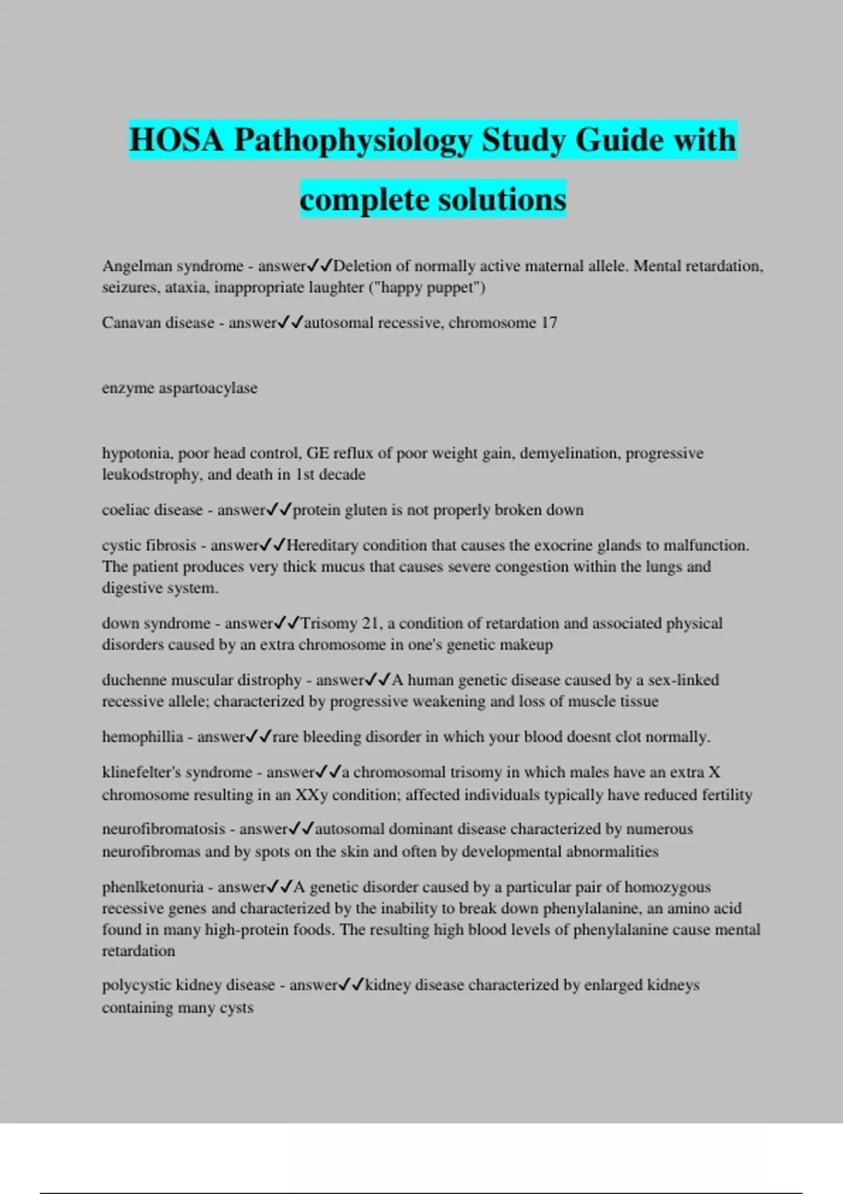 HOSA Pathophysiology Study Guide with complete solutions Angelman syndrome - answerDeletion of normally active maternal allele. Mental retardation, seizures, ataxia, inappropriate laughter ("happy puppet") Canavan disease - answerautosomal recessive, chromosome 17 enzyme aspartoacylase hypotonia, poor head control, GE reflux of poor weight gain, demyelination, progressive leukodstrophy, and death in 1st decade coeliac disease - answerprotein gluten is not properly broken down cystic fibrosis - answerHereditary condition that causes the exocrine glands to malfunction. The patient produces very thick mucus that causes severe congestion within the lungs and digestive system. down syndrome - answerTrisomy 21, a condition of retardation and associated physical disorders caused by an extra chromosome in one's genetic makeup duchenne muscular distrophy - answerA human genetic disease caused by a sex-linked recessive allele; characterized by progressive weakening and loss of muscle tissue hemophillia - answerrare bleeding disorder in which your blood doesnt clot normally. klinefelter's syndrome - answera chromosomal trisomy in which males have an extra X chromosome resulting in an XXy condition; affected individuals typically have reduced fertility neurofibromatosis - answerautosomal dominant disease characterized by numerous neurofibromas and by spots on the skin and often by developmental abnormalities phenlketonuria - answerA genetic disorder caused by a particular pair of homozygous recessive genes and characterized by the inability to break down phenylalanine, an amino acid found in many high-protein foods. The resulting high blood levels of phenylalanine cause mental retardation polycystic kidney disease - answerkidney disease characterized by enlarged kidneys containing many cysts