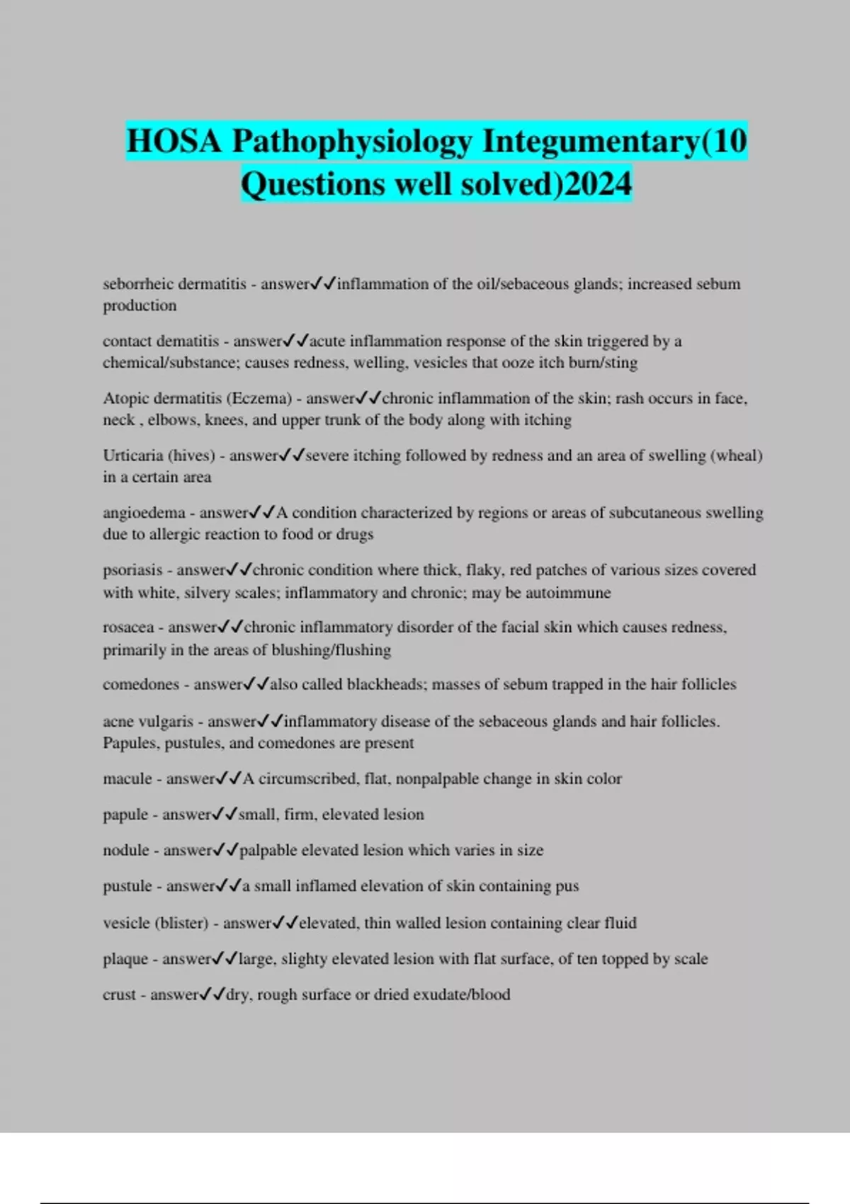 HOSA Pathophysiology Integumentary(10 Questions well solved)2024