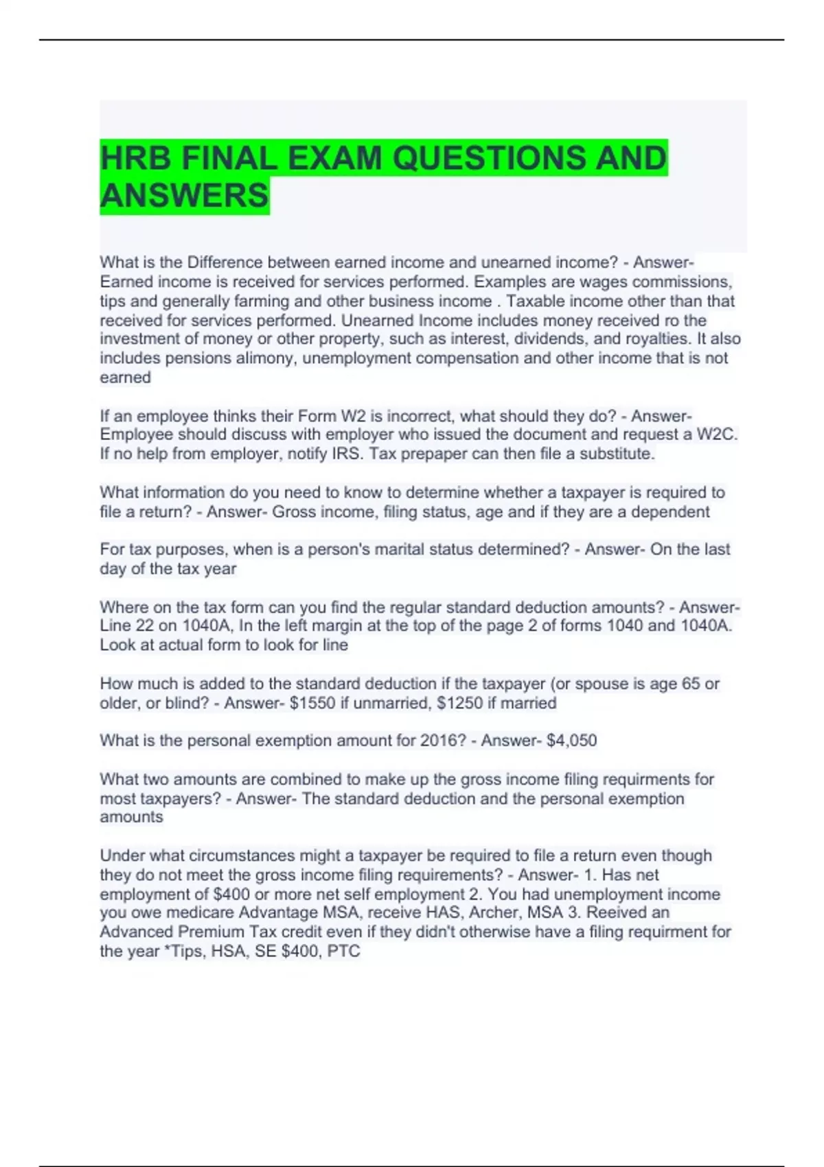 HRB FINAL EXAM QUESTIONS AND ANSWERS