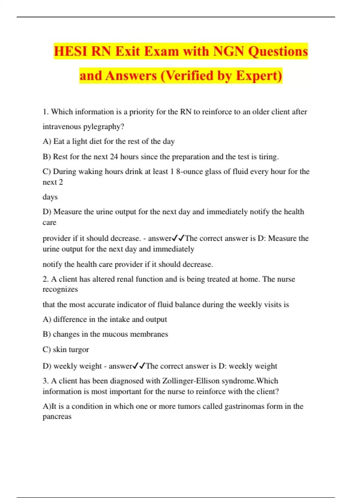 HESI RN Exit Exam with NGN Questions and Answers (Verified by Expert) 1. Which information is a priority for the RN to reinforce to an older client after intravenous pylegraphy? A) Eat a light diet for the rest of the day B) Rest for the next 24 hours since the preparation and the test is tiring. C) During waking hours drink at least 1 8-ounce glass of fluid every hour for the next 2 days D) Measure the urine output for the next day and immediately notify the health care provider if it should decrease. - answerThe correct answer is D: Measure the urine output for the next day and immediately notify the health care provider if it should decrease. 2. A client has altered renal function and is being treated at home. The nurse recognizes that the most accurate indicator of fluid balance during the weekly visits is A) difference in the intake and output B) changes in the mucous membranes C) skin turgor D) weekly weight - answerThe correct answer is D: weekly weight 3. A client has been diagnosed with Zollinger-Ellison syndrome.Which information is most important for the nurse to reinforce with the client? A)It is a condition in which one or more tumors called gastrinomas form in the pancreas or in the upper part of the small intestine (duodenum) B)It is critical to report promptly to your health care provider any findings of peptic ulcers c)Treatment consists of medications to reduce acid and heal any peptic ulcers and, if possible, surgery to remove any tumors D)With the average age at diagnosis at 50 years the peptic ulcers may occur at unusual areas of the stomach or intestine - answerThe correct answer is B: It is critical to report promptly to your health care provider any findings of peptic ulcers. 4. A primigravida in the third trimester is hospitalized for preeclampsia. The nurse determines that the client's blood pressure is increasing. Which action should the nurse take first? A) Check the protein level in urine B) Have the client turn to the left side C) Take the temperature D) Monitor the urine output - answerThe correct answer is B: Have the client turn to the left si