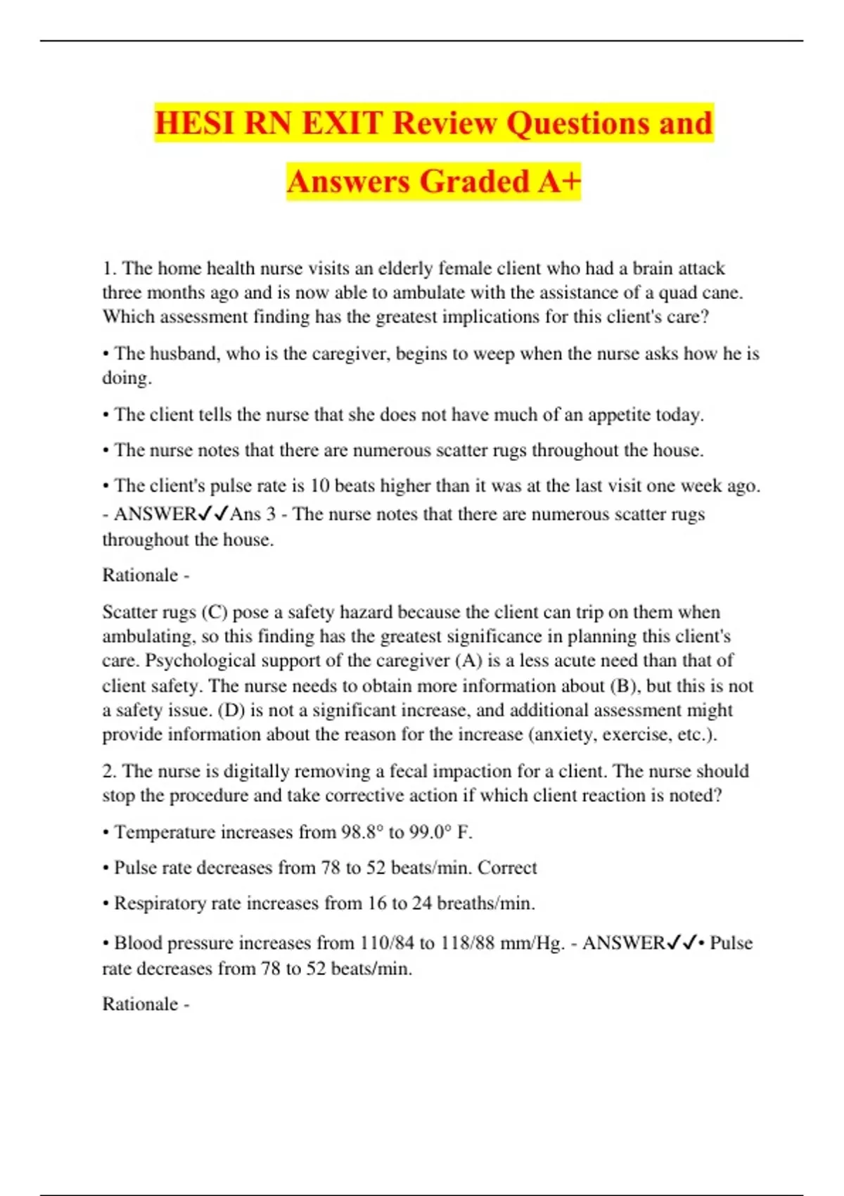 HESI RN EXIT Review Questions and Answers Graded A+ 1. The home health nurse visits an elderly female client who had a brain attack three months ago and is now able to ambulate with the assistance of a quad cane. Which assessment finding has the greatest implications for this client's care? • The husband, who is the caregiver, begins to weep when the nurse asks how he is doing. • The client tells the nurse that she does not have much of an appetite today. • The nurse notes that there are numerous scatter rugs throughout the house. • The client's pulse rate is 10 beats higher than it was at the last visit one week ago. - ANSWERAns 3 - The nurse notes that there are numerous scatter rugs throughout the house. Rationale - Scatter rugs (C) pose a safety hazard because the client can trip on them when ambulating, so this finding has the greatest significance in planning this client's care. Psychological support of the caregiver (A) is a less acute need than that of client safety. The nurse needs to obtain more information about (B), but this is not a safety issue. (D) is not a significant increase, and additional assessment might provide information about the reason for the increase (anxiety, exercise, etc.). 2. The nurse is digitally removing a fecal impaction for a client. The nurse should stop the procedure and take corrective action if which client reaction is noted? • Temperature increases from 98.8° to 99.0° F. • Pulse rate decreases from 78 to 52 beats/min. Correct • Respiratory rate increases from 16 to 24 breaths/min. • Blood pressure increases from 110/84 to 118/88 mm/Hg. - ANSWER• Pulse rate decreases from 78 to 52 beats/min. Rationale - Parasympathetic reaction can occur as a result of digital stimulation of the anal sphincter, which should be stopped if the client experiences a vagal response, such as bradycardia (B). (A, C, and D) do not warrant stopping the procedure. 3. The nurse is providing passive range of motion (ROM) exercises to the hip and knee for a client who is unconscious. After supporting the client's knee with one hand, what action should the nurse take next? • Raise the bed to a comfortable working level. • Bend the client's knee. • Move the knee toward the chest as far as it will go. • Cradle the client's heel. Correct - ANSWER•Ans - Cradle the client's heel. Correct Passive ROM exercise for the hip and knee is provided by supporting the joints of the knee and ankle (D) and gently moving the limb in a slow, smooth, firm but gentle manner. (A) should be done before the exercises are begun to prevent injury to the nurse and client. (B) is carried out after both joints are supported. After the knee is bent, then the knee is moved toward the chest to the point of resistance (C) two or three times. 4. A client who has moderate, persistent, chronic neuropathic pain due to diabetic neuropathy takes gabapentin (Neurontin) and ibuprofen (Motrin, Advil) daily. If Step 2 of the World Health Organization (WHO) pain relief ladder is prescribed, which drug protocol should be implemented? • Continue gabapentin. Correct • Discontinue ibuprofen. • Add aspirin to the protocol. Add oral methadone to the protocol - ANSWERAns 1 - Continue gabapentin Based on the WHO pain relief
