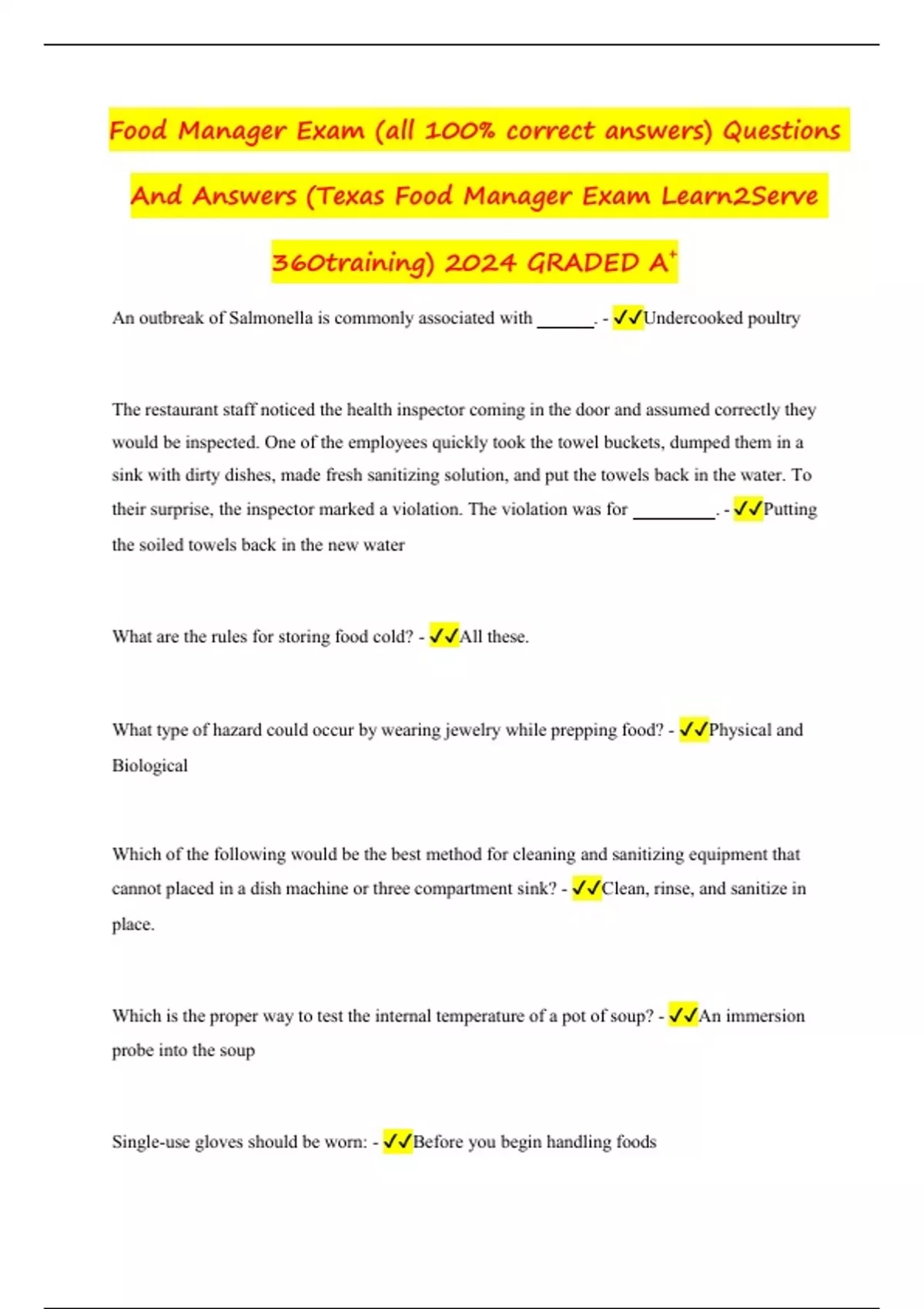 Food Manager Exam (all 100% correct answers) Questions And Answers (Texas Food Manager Exam Learn2Serve 360training) 2023
