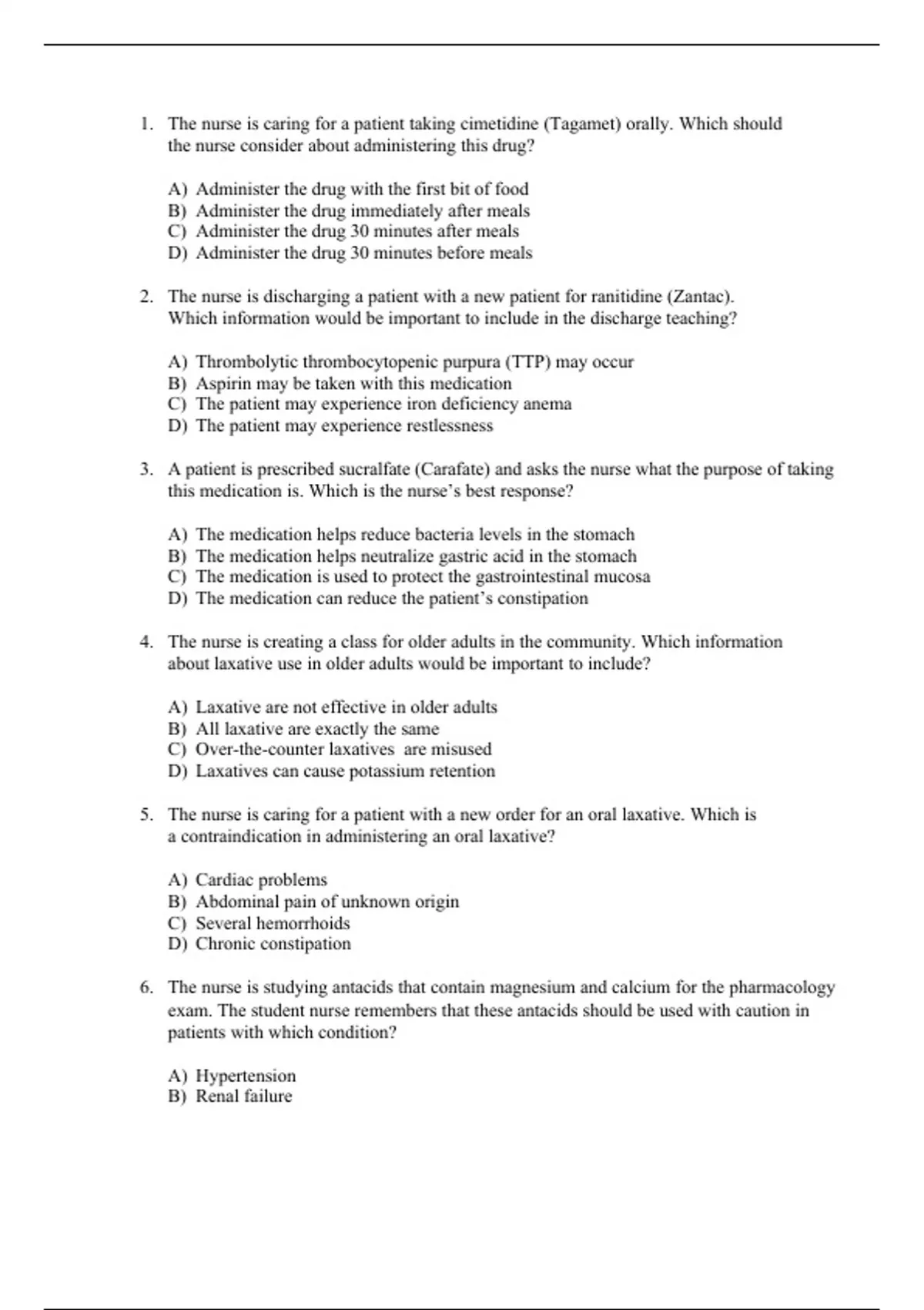 6. The nurse is studying antacids that contain magnesium and calcium for the pharmacology