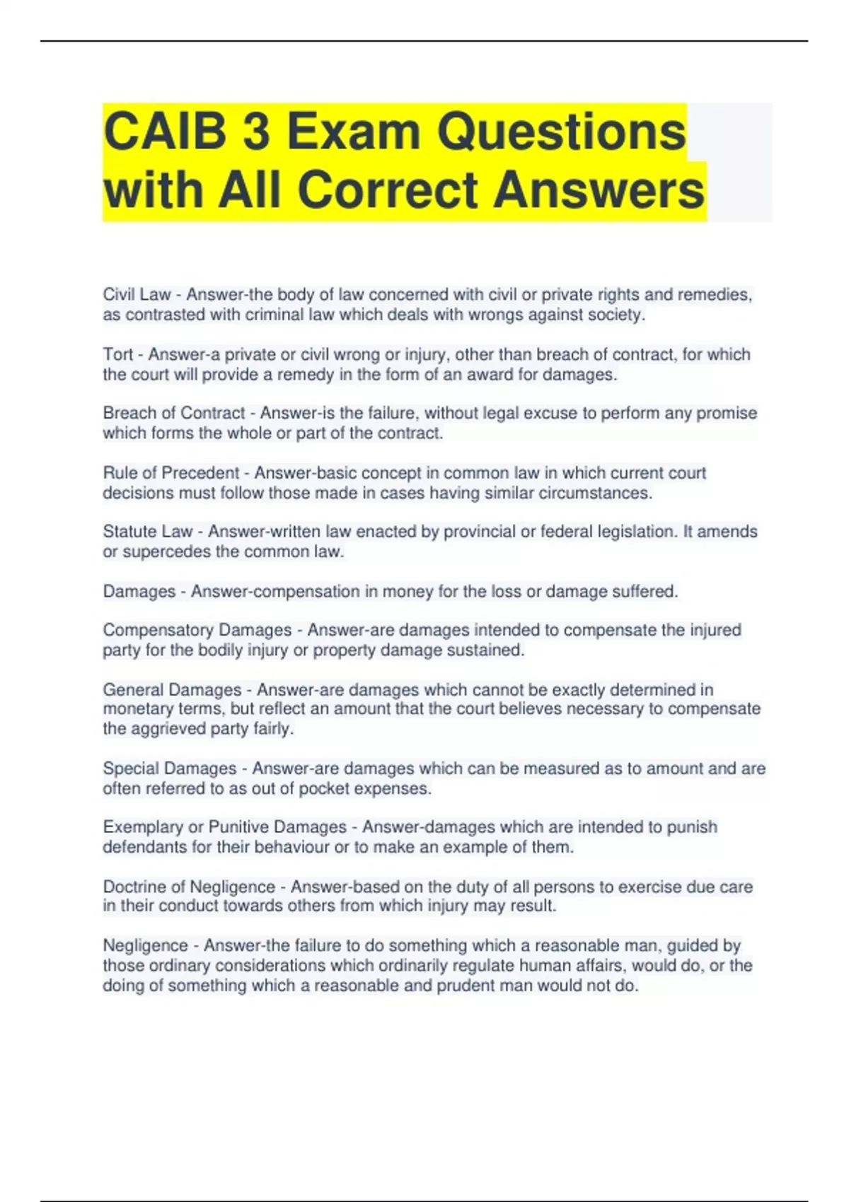 CAIB 3 Exam Questions with All Correct Answers Civil Law - Answer-the body of law concerned with civil or private rights and remedies, as contrasted with criminal law which deals with wrongs against society. Tort - Answer-a private or civil wrong or injury, other than breach of contract, for which the court will provide a remedy in the form of an award for damages. Breach of Contract - Answer-is the failure, without legal excuse to perform any promise which forms the whole or part of the contract. Rule of Precedent - Answer-basic concept in common law in which current court decisions must follow those made in cases having similar circumstances. Statute Law - Answer-written law enacted by provincial or federal legislation. It amends or supercedes the common law. Damages - Answer-compensation in money for the loss or damage suffered. Compensatory Damages - Answer-are damages intended to compensate the injured party for the bodily injury or property damage sustained. General Damages - Answer-are damages which cannot be exactly determined in monetary terms, but reflect an amount that the court believes necessary to compensate the aggrieved party fairly. Special Damages - Answer-are damages which can be measured as to amount and are often referred to as out of pocket expenses. Exemplary or Punitive Damages - Answer-damages which are intended to punish defendants for their behaviour or to make an example of them. Doctrine of Negligence - Answer-based on the duty of all persons to exercise due care in their conduct towards others from which injury may result.