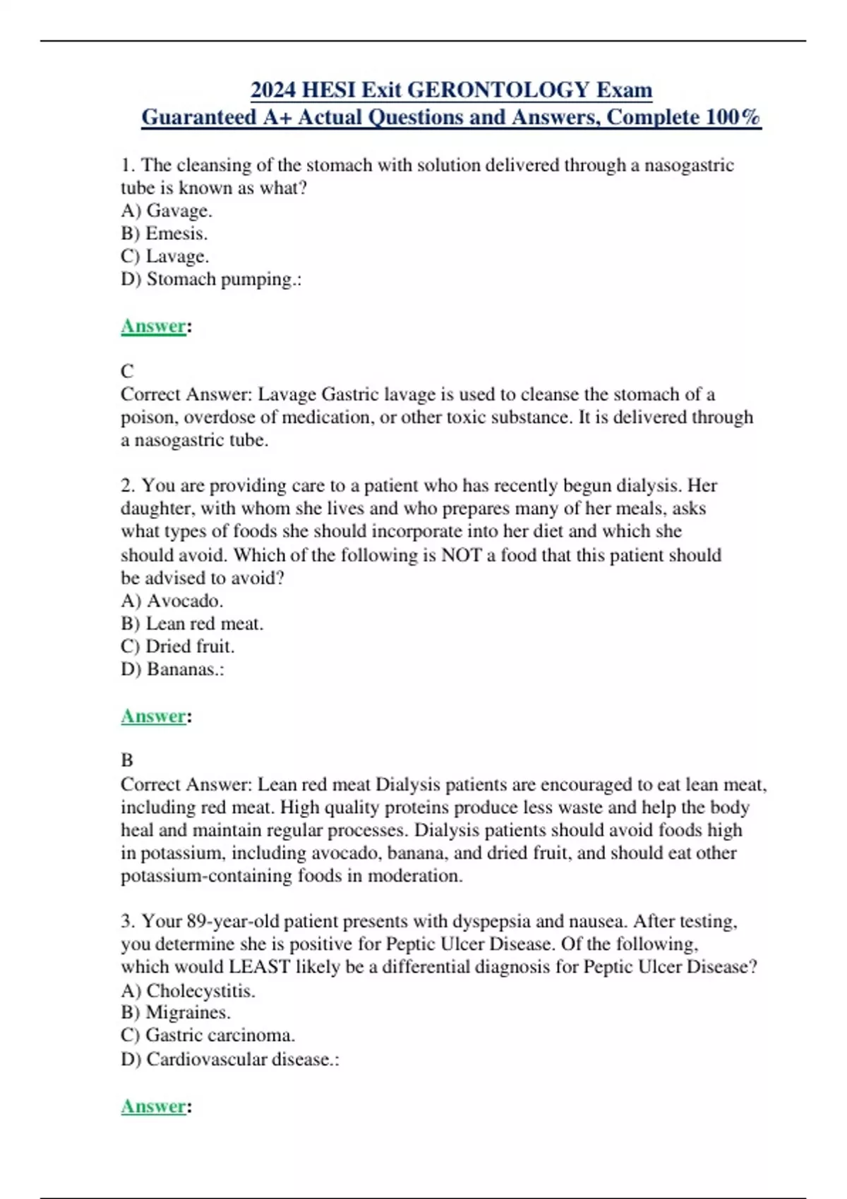 2024 HESI Exit GERONTOLOGY Exam Guaranteed A+ Actual Questions and Answers, Complete 100% 1. The cleansing of the stomach with solution delivered through a nasogastric tube is known as what? A) Gavage. B) Emesis. C) Lavage. D) Stomach pumping.: Answer: C Correct Answer: Lavage Gastric lavage is used to cleanse the stomach of a poison, overdose of medication, or other toxic substance. It is delivered through a nasogastric tube. 2. You are providing care to a patient who has recently begun dialysis. Her daughter, with whom she lives and who prepares many of her meals, asks what types of foods she should incorporate into her diet and which she should avoid. Which of the following is NOT a food that this patient should be advised to avoid? A) Avocado. B) Lean red meat. C) Dried fruit. D) Bananas.: Answer: B Correct Answer: Lean red meat Dialysis patients are encouraged to eat lean meat, including red meat. High quality proteins produce less waste and help the body heal and maintain regular processes. Dialysis patients should avoid foods high in potassium, including avocado, banana, and dried fruit, and should eat other potassium-containing foods in moderation. 3. Your 89-year-old patient presents with dyspepsia and nausea. After testing, you determine she is positive for Peptic Ulcer Disease. Of the following, which would LEAST likely be a differential diagnosis for Peptic Ulcer Disease? A) Cholecystitis. B) Migraines. C) Gastric carcinoma. D) Cardiovascular disease.: Answer: B Correct answer: Migraines Peptic Ulcer Disease is a gastrointestinal disorder. Other differential diagnoses of the condition are pancreatitis and biliary tract disease.