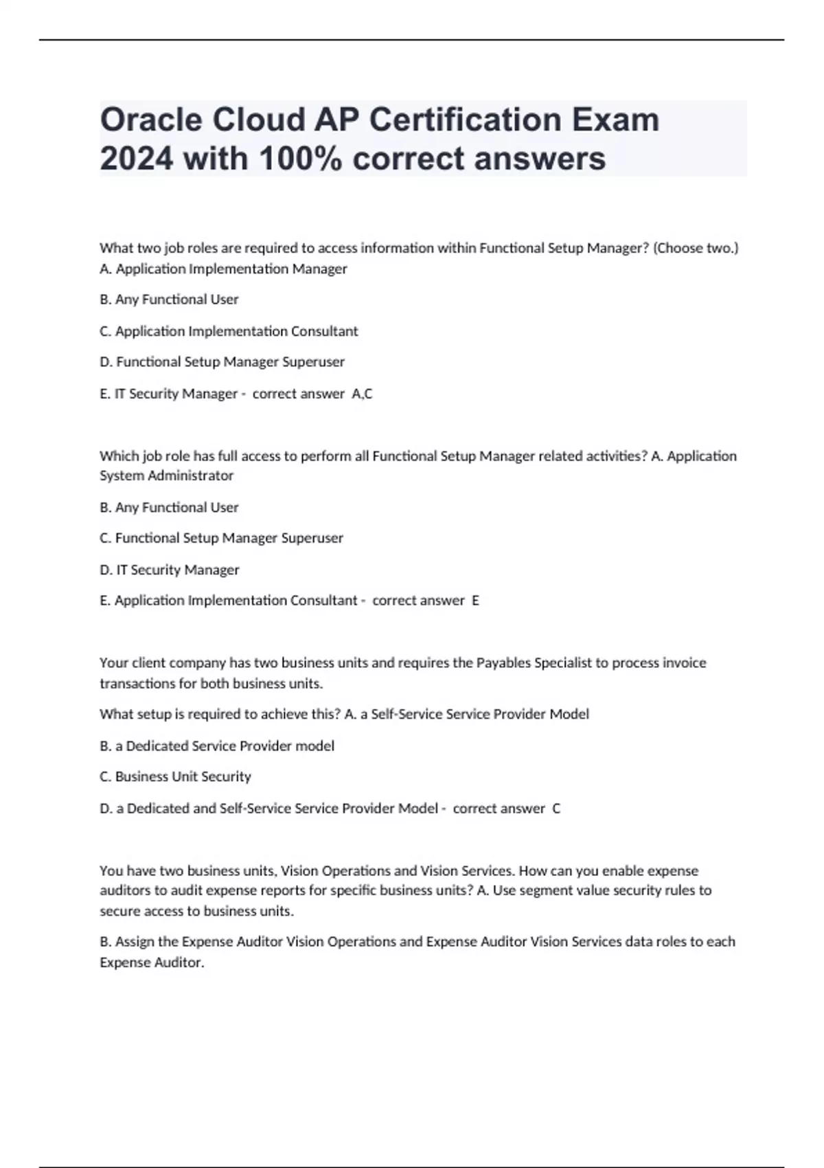 What two job roles are required to access information within Functional Setup Manager? (Choose two.) A. Application Implementation Manager B. Any Functional User C. Application Implementation Consultant D. Functional Setup Manager Superuser E. IT Security Manager - correct answer A,C Which job role has full access to perform all Functional Setup Manager related activities? A. Application System Administrator B. Any Functional User C. Functional Setup Manager Superuser D. IT Security Manager E. Application Implementation Consultant - correct answer E Your client company has two business units and requires the Payables Specialist to process invoice transactions for both business units. What setup is required to achieve this? A. a Self-Service Service Provider Model B. a Dedicated Service Provider model C. Business Unit Security D. a Dedicated and Self-Service Service Provider Model - correct answer C You have two business units, Vision Operations and Vision Services. How can you enable expense auditors to audit expense reports for specific business units? A. Use segment value security rules to secure access to business units. B. Assign the Expense Auditor Vision Operations and Expense Auditor Vision Services data roles to each Expense Auditor. C. Assign the Expense Auditor as the owner of each business unit. D. Assign the Expense Auditor job roles to each auditor. - correct answer B You need to enter a high volume of users into the system. What is Oracle's recommendation to do this? A. Use the Enter a Supplier user interface and enter each user manually. B. Use the Hire an Employee user interface and enter each user manually. C. Use the spreadsheet templates available in Oracle Enterprise Repository (OER) and then import users into Cloud Applications. D. use the spreadsheet of Oracle Identity Manager (OIM) to import users. - correct answer D You have created your first implementation project. You have assigned the Application Implementation Consultant role to your user. However, you are unable to create and add roles to users in Oracle Identity Management (OIM). This issue is caused because you did not assign the ________. A. Superuser role to your user B. IT Security Manager role to your user C. Application Implementation Manager role to your user D. Line Manager role to your user - correct answer C