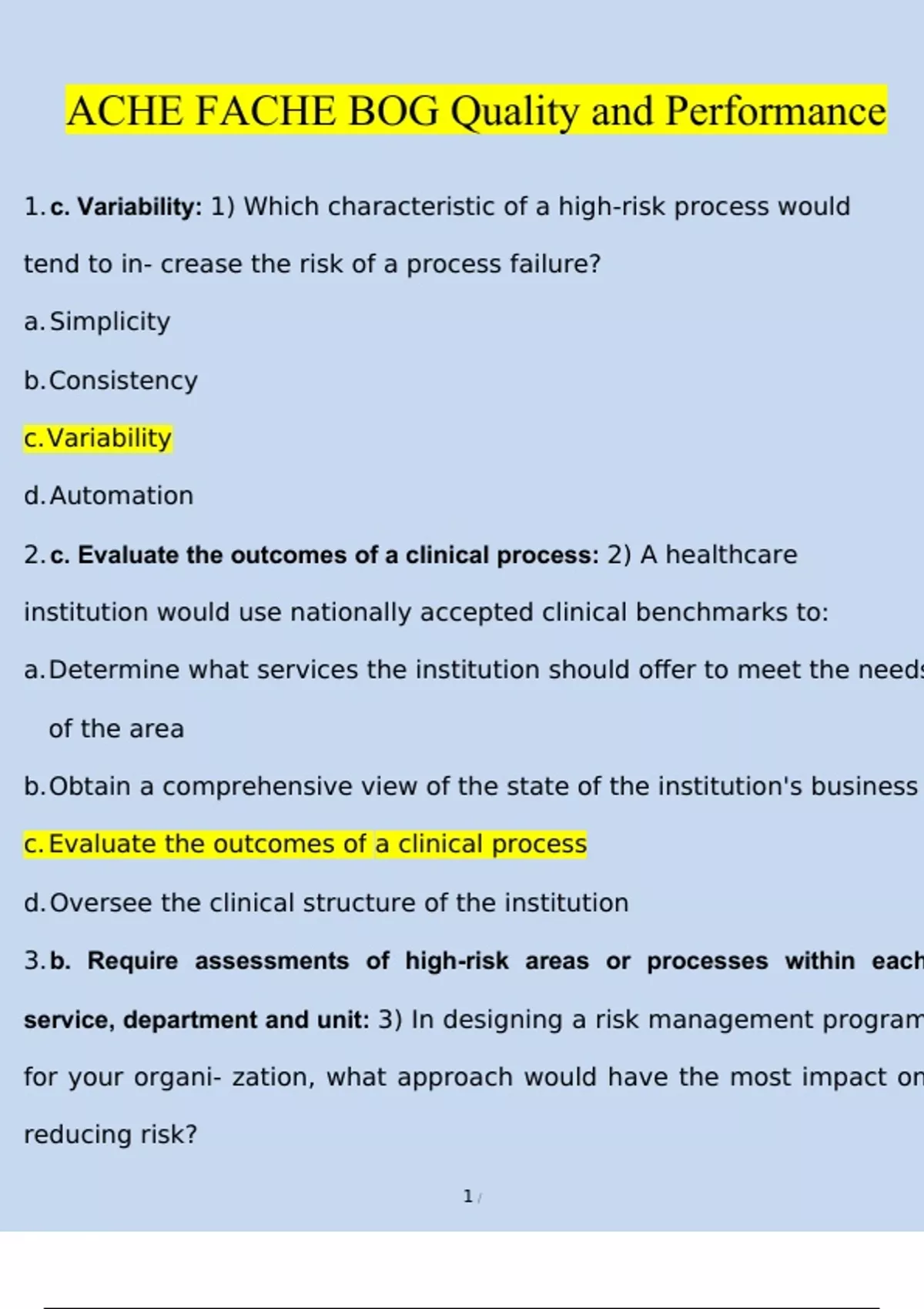 ACHE FACHE BOG Quality and Performance | Questions with 100% Correct Answers | Verified | Updated 2024