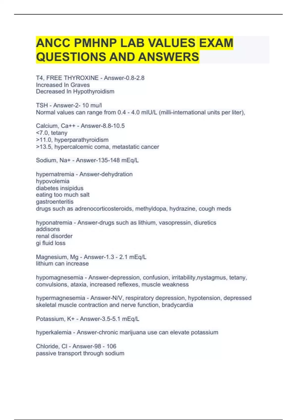 ANCC PMHNP LAB VALUES EXAM QUESTIONS AND ANSWERS.