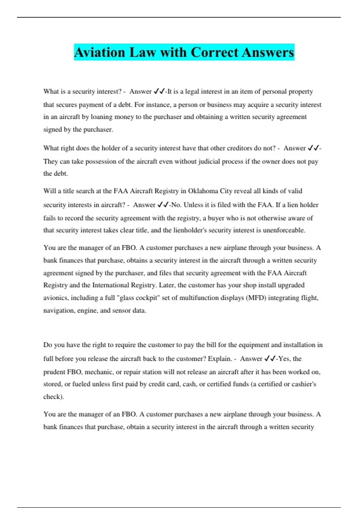What is a security interest? - Answer ️️-It is a legal interest in an item of personal property that secures payment of a debt. For instance, a person or business may acquire a security interest in an aircraft by loaning money to the purchaser and obtaining a written security agreement signed by the purchaser. What right does the holder of a security interest have that other creditors do not? - Answer ️️-They can take possession of the aircraft even without judicial process if the owner does not pay the debt . Will a title search at the FAA Aircraft Registry in Oklahoma City reveal all kinds of valid security interests in aircraft? - Answer ️️-No. Unless it is filed with the FAA. If a lien holder fails to record the security agreement with the registry, a buyer who is not otherwise aware of that security interest takes clear title, and the lienholder's security interest is unenforceable.