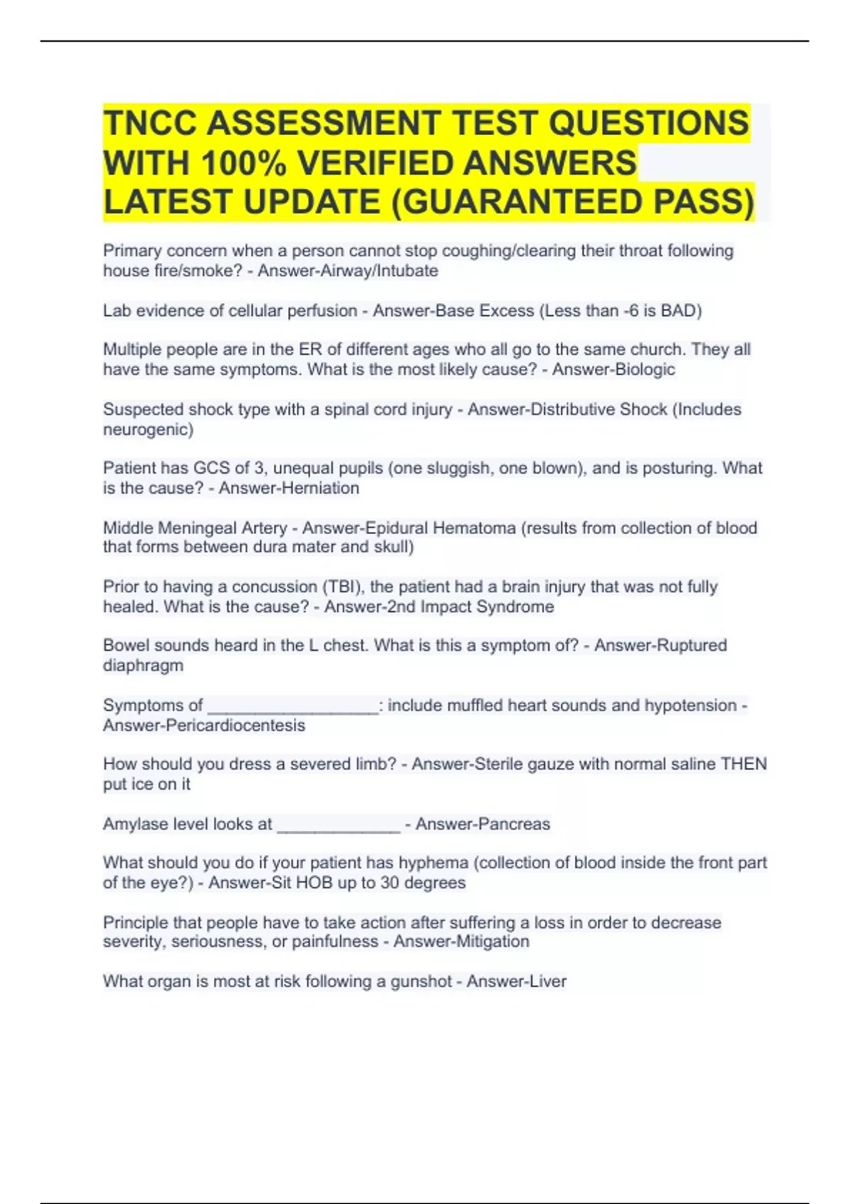 TNCC ASSESSMENT TEST QUESTIONS WITH 100% VERIFIED ANSWERS LATEST UPDATE