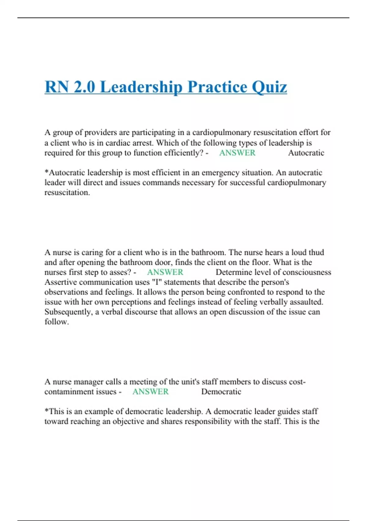 RN 2.0 Leadership Practice Quiz A group of providers are participating in a cardiopulmonary resuscitation effort for a client who is in cardiac arrest. Which of the following types of leadership is required for this group to function efficiently? - ANSWER Autocratic *Autocratic leadership is most efficient in an emergency situation. An autocratic leader will direct and issues commands necessary for successful cardiopulmonary resuscitation. A nurse is caring for a client who is in the bathroom. The nurse hears a loud thud and after opening the bathroom door, finds the client on the floor. What is the nurses first step to asses? - ANSWER Determine level of consciousness Assertive communication uses "I" statements that describe the person's observations and feelings. It allows the person being confronted to respond to the issue with her own perceptions and feelings instead of feeling verbally assaulted. Subsequently, a verbal discourse that allows an open discussion of the issue can follow. A nurse manager calls a meeting of the unit's staff members to discuss cost-contaminment issues - ANSWER Democratic *This is an example of democratic leadership. A democratic leader guides staff toward reaching an objective and shares responsibility with the staff. This is the ideal type of leadership in this situation because a great amount of creativity can occur and many strategies can be developed. A nurse is preparing to give change of shift report to the oncoming nurse. Which of the following information should the nurse include? - ANSWER Objective measurements about the client's condition