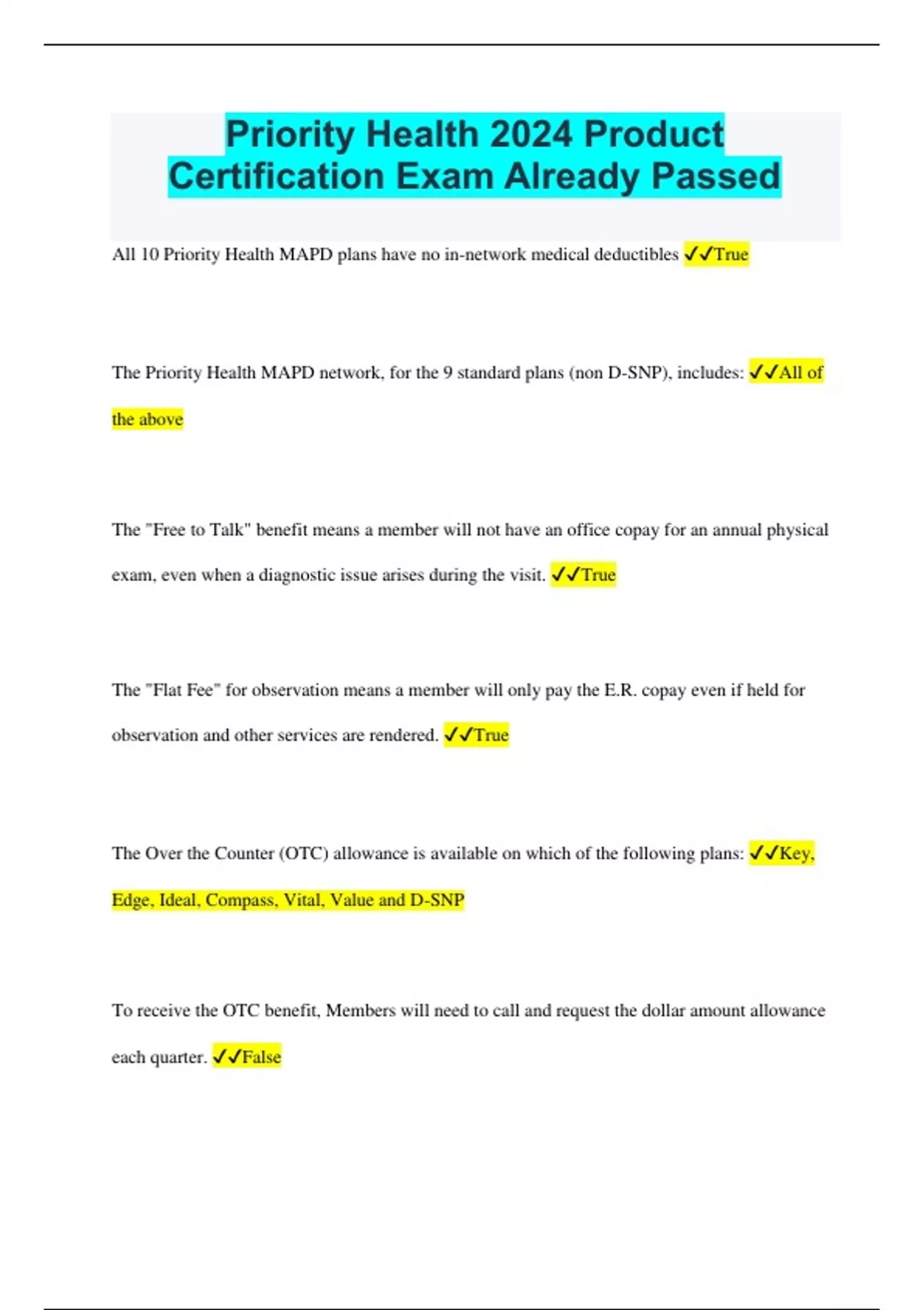 Priority Health 2024 Product Certification Exam Already Passed All 10 Priority Health MAPD plans have no in-network medical deductibles True The Priority Health MAPD network, for the 9 standard plans (non D-SNP), includes: All of the above The "Free to Talk" benefit means a member will not have an office copay for an annual physical exam, even when a diagnostic issue arises during the visit. True The "Flat Fee" for observation means a member will only pay the E.R. copay even if held for observation and other services are rendered. True The Over the Counter (OTC) allowance is available on which of the following plans: Key, Edge, Ideal, Compass, Vital, Value and D-SNP To receive the OTC benefit, Members will need to call and request the dollar amount allowance each quarter. False All 9 standard Priority Health MAPD plans (non D-SNP) include Dental, Vision and Hearing embedded benefits in the medical plan. True All 9 standard Priority Health MAPD plans (non D-SNP) will cover claims outside of Michigan at the in-network benefit level for any Medicare participating provider AND with MultiPlan Medicare providers True All 9 Priority Health Standard MAPD plans (non D-SNP) include "Assist America" emergency travel assistance. True Priority Health optional enhanced Dental and Vision now includes which of the following? All of the above Priority Health MAPD plans offer in-home health assessments at no cost to the member. True The PriorityMedicare Edge PPO plan is ONLY available to beneficiaries residing in Region 5 False All 9 standard Priority Health MAPD plans (non D-SNP) include $0 copay for tier 1&2 90 day supply of mail order drugs. True All 9 standard Priority Health MAPD plans (non D-SNP) include preferred pharmacy copays. True All 10 Priority Health MAPD plans, HMO-POS, PPO and D-SNP, use the same Medicare Advantage Network in Michigan. True All 9 standard Priority Health MAPD plans (non D-SNP) both HMO-POS and PPO plans do NOT require a PCP referral to see an in-network Specialist True Priority Health MAPD Plans Edge, Key, Compass, Vital and Ideal cover 12 routine chiropractic visits per year. True Which of the following is true about the optional Dental/Vision benefit: All of the above Priority Health Medicare D-SNP (HMO) plan includes: All of the above Priority Health Medicare D-SNP (HMO) plan: All of the above Priority Health Medigap plans allow "Fast Track" simplified underwriting for applicants within 3 years of Part B Medicare enrollment. True PriorityMedicare members have in-network benefits, when out of state, when seeing Medicare providers in the MultiPlan Medicare network, or with any Medicare participating provider. True Which plans include Companion Care powered by PAPA? PriorityMedicare Edge, PrioirtyMedicare Compass Plan, PriorityMedicare Ideal and D-SNP only Signify Health provides PriorityMedicare members with a free in-home health assessment for what reason(s)? All of the above Priority MAPD members are eligible for a hearing benefit which includes $0 copay routine hearing exam and tiered copay options for hearing aids. The members can visit any hearing provider to obtain these benefits. False PriorityMedicare has partnered with myStrength, the "health club for your mind" to provide free online access to the following mental wellness tools: All of the Above Acupuncture covers for all Priority Health Medicare members with a $20 copay per session and $0 copay for PriorityMedicare D-SNP members for up to 20 visits for chronic lower back and 6 visits other conditions. True PriorityMedicare Edge plan is a great choice for newly aging-in members and those who want a PPO for a $0 premium in regions 1, 2 & 5. True PriorityMedicare Key plan is a great choice state-wide for newly aging-in members and those who want more embedded dental and insulin coverage in the gap on a $0 premium plan. True PriorityMedicare Vital is geared for people who are on Original Medicare who want extras and a safety net, featuring a 20% coinsurance on most benefits. True The PriorityMedicare Vital (PPO) plan includes a $30 Part B monthly premium reduction ($360/year) True The PriorityMedicare Key plan was enhanced to include which of the following benefits? All of the Above All 10 Priority Health MAPD Plans, HMO-POS, PPO, and D-SNP include up to two weeks of meals following an inpatient hospital stay. True Priority Health D-SNP (HMO) now includes which of the following benefits? All of the Above Priority Health D-SNP (HMO) now includes which of the following embedded comprehensive dental benefits? All of the Above