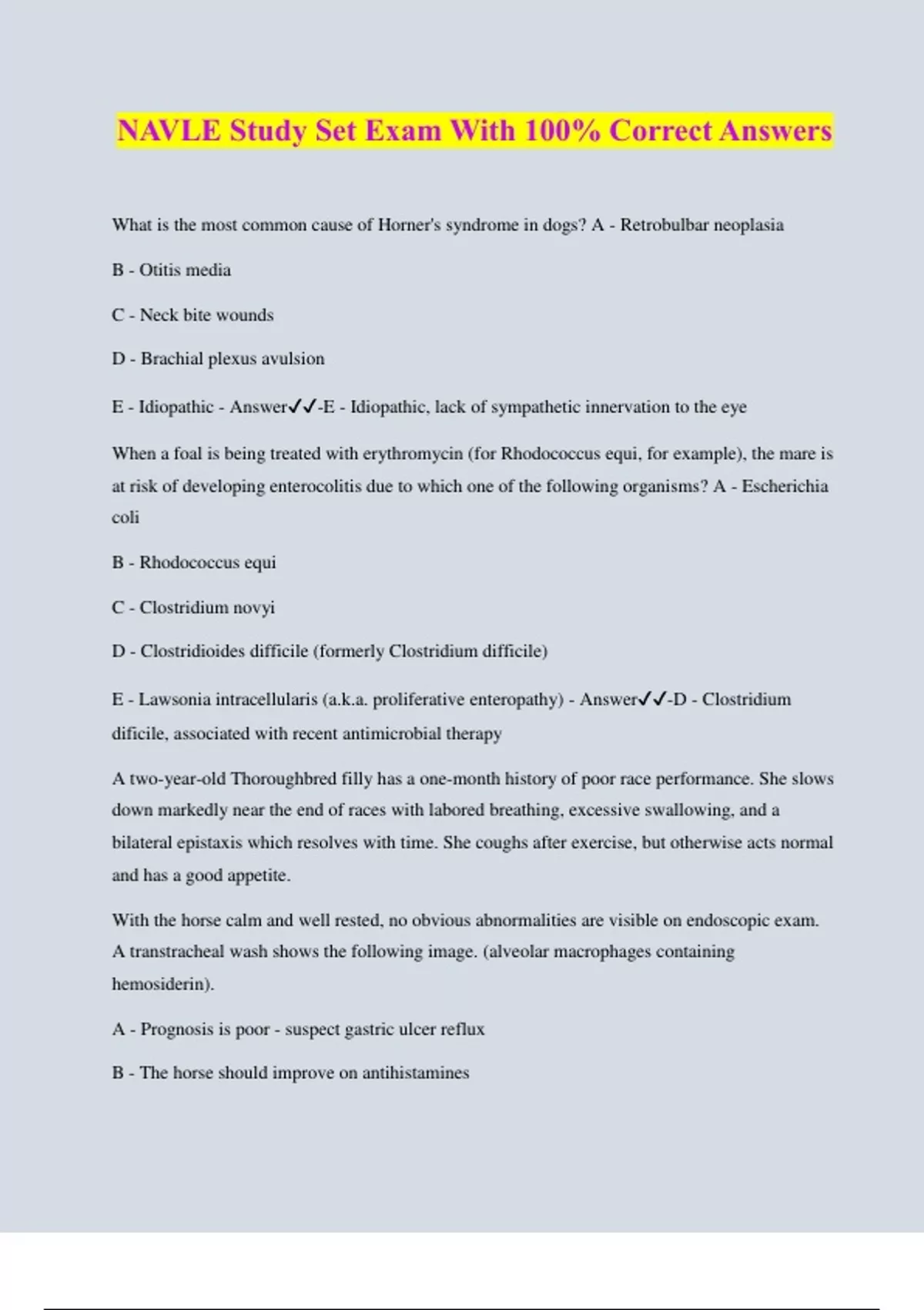 What is the most common cause of Horner's syndrome in dogs? A - Retrobulbar neoplasia B - Otitis media C - Neck bite wounds D - Brachial plexus avulsion E - Idiopathic - Answer️️-E - Idiopathic, lack of sympathetic innervation to the eye When a foal is being treated with erythromycin (for Rhodococcus equi, for example), the mare is at risk of developing enterocolitis due towhich one of the following organisms? A - Escherichia coli B - Rhodococcus equi C - Clostridium novyi D - Clostridioides difficile (formerly Clostridium difficile) E - Lawsonia intracellularis (a.k.a. proliferative enteropathy) - Answer️️-D - Clostridium dificile, associated with recent antimicrobial therapy