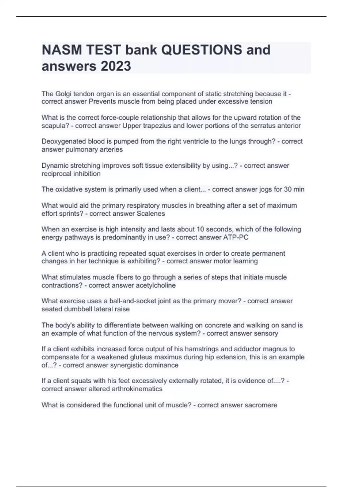 NASM TEST QUESTIONS AND CORRECT ANSWERS .