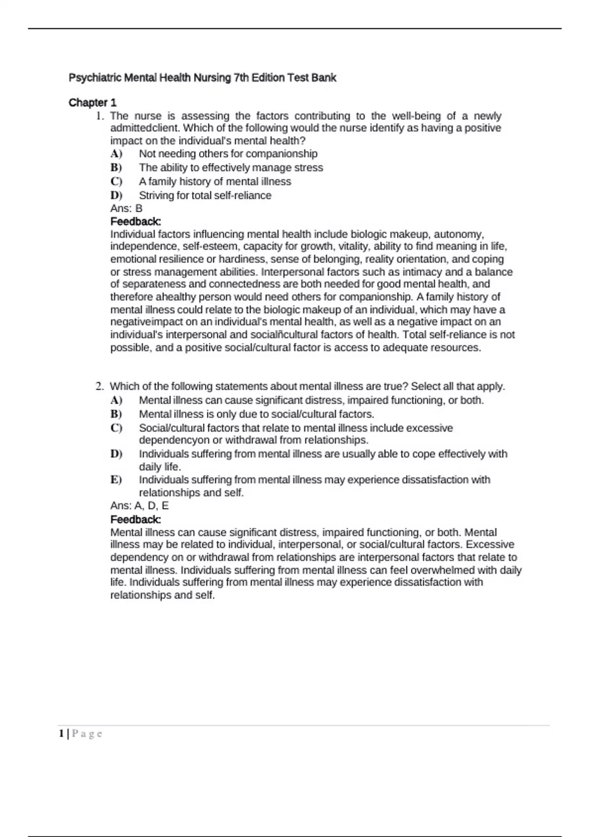 TEST BANK PSYCHIATRIC MENTAL HEALTH NURSING 7TH EDITION VIDEBECKChapter 1 1. The nurse is assessing the factors contributing to the well-being of a newly admitted client. Which of the following would the nurse identify as having a positive impact on the individual's mental health? A) Not needing others for companionship B) The ability to effectively manage stress C) A family history of mental illness D) Striving for total self-reliance Ans: B Feedback: Individual factors influencing mental health include biologic makeup, autonomy, independence, self-esteem, capacity for growth, vitality, ability to find meaning in life, emotional resilience or hardiness, sense of belonging, reality orientation, and coping or stress management abilities. Interpersonal factors such as intimacy and a balance of separateness and connectedness are both needed for good mental health, and therefore a healthy person would need others for companionship. A family history of mental illness could relate to the biologic makeup of an individual, which may have a negative impact on an individual's mental health, as well as a negative impact on an individual's interpersonal and socialñcultural factors of health. Total self-reliance is not possible, and a positive social/cultural factor is access to adequate resources. 2. Which of the following statements about mental illness are true? Select all that apply. A) Mental illness can cause significant distress, impaired functioning, or both. B) Mental illness is only due to social/cultural factors. C) Social/cultural factors that relate to mental illness include excessive dependency on or withdrawal from relationships. D) Individuals suffering from mental illness are usually able to cope effectively with daily life. E) Individuals suffering from mental illness may experience dissatisfaction with relationships and self. Ans: A, D, E Feedback: Mental illness can cause significant distress, impaired functioning, or both. Mental illness may be related to individual, interpersonal, or social/cultural factors. Excessive dependency on or withdrawal from relationships are interpersonal factors that relate to mental illness. Individuals suffering from mental illness can feel overwhelmed with daily life. Individuals suffering from mental illness may experience dissatisfaction with relationships and self. 1 | P a g e3. Which of the following are true regarding mental health and mental illness? A) Behavior that may be viewed as acceptable in one culture is always unacceptable in other cultures. B) It is easy to determine if a person is mentally healthy or mentally ill. C) In most cases, mental health is a state of emotional, psychological, and social wellness evidenced by satisfying interpersonal relationships, effective behavior and coping, positive self-concept, and emotional stability. D) Persons who engage in fantasies are mentally ill. Ans: C Feedback: What one society may view as acceptable and appropriate behavior, another society may see that as maladaptive, and inappropriate. Mental health and mental illness are difficult to define precisely. In most cases, mental health is a state of emotional, psychological, and social wellness evidenced by satisfying interpersonal relationships, effective behavior and coping, positive self-concept, and emotional stability. Persons who engage in fantasies may be mentally healthy, but the inability to distinguish reality from fantasy is an individual factor that may contribute to mental illness. 4. A client grieving the recent loss of her husband asks if she is becoming mentally ill because she is so sad. The nurse's best response would be, A) ìYou may have a temporary mental illness because you are experiencing so much pain.î B) ìYou are not mentally ill. This is an expected reaction to the loss you have experienced.î C) ìWere you generally dissatisfied with your relationship before your husband's death?î D) ìTry not to worry about that right now. You never know what the future brings.î Ans: B Feedback: Mental illness includes general dissatisfaction with self, ineffective relationships, ineffective coping, and lack of personal growth. Additionally the behavior must not be culturally expected. Acute grief reactions are expected and therefore not considered mental illness. False reassurance or overanalysis does not accurately address the client's concerns. 5. The nurse consults the DSM for which of the following purposes? A) To devise a plan of care for a newly admitted client B) To predict the client's prognosis of treatment outcomes C) To document the appropriate diagnostic code in the client's medical record D) To serve as a guide for client assessment Ans: D Feedback: The DSM provides standard nomenclature, presents defining characteristics, and identifies underlying causes of mental disorders. It does not provide care plans or prognostic outcomes of treatment. Diagnosis of mental illness is not within the 2 | P a g egeneralist RN's scope of practice, so documenting the code in the medical record would be inappropriate. 6. Which would be a reason for a student nurse to use the DSM? A) Identifying the medical diagnosis B) Treat clients C) Evaluate treatments D) Understand the reason for the admission and the nature of psychiatric illnesses. Ans: D Feedback: Although student nurses do not use the DSM to diagnose clients, they will find it a helpful resource to understand the reason for the admission and to begin building knowledge about the nature of psychiatric illnesses. Identifying the medical diagnosis, treating, and evaluating treatments are not a part of the nursing process. 7. The legislation enacted in 1963 was largely responsible for which of the following shifts in care for the mentally ill? A) The widespread use of community-based services B) The advancement in pharmacotherapies C) Increased access to hospitalization D) Improved rights for clients in long-term institutional care Ans: A Feedback: The Community Mental Healt