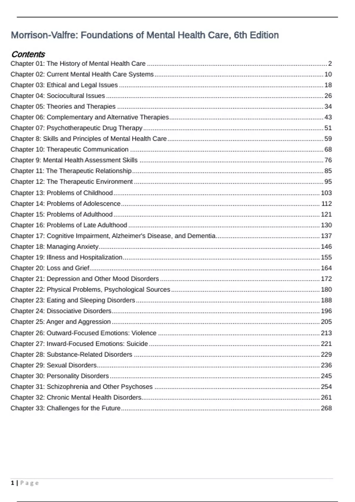 Test Bank Morrison-Valfre Foundations of Mental Health Care, 6th EditionContents Chapter 01: The History of Mental Health Care ................................................................................................. 2 Chapter 02: Current Mental Health Care Systems ........................................................................................... 10 Chapter 03: Ethical and Legal Issues .............................................................................................................. 18 Chapter 04: Sociocultural Issues ..................................................................................................................... 26 Chapter 05: Theories and Therapies ............................................................................................................... 34 Chapter 06: Complementary and Alternative Therapies ................................................................................... 43 Chapter 07: Psychotherapeutic Drug Therapy ................................................................................................. 51 Chapter 8: Skills and Principles of Mental Health Care .................................................................................... 59 Chapter 10: Therapeutic Communication ........................................................................................................ 68 Chapter 9: Mental Health Assessment Skills ................................................................................................... 76 Chapter 11: The Therapeutic Relationship ....................................................................................................... 85 Chapter 12: The Therapeutic Environment ...................................................................................................... 95 Chapter 13: Problems of Childhood ............................................................................................................... 103 Chapter 14: Problems of Adolescence ........................................................................................................... 112 Chapter 15: Problems of Adulthood ............................................................................................................... 121 Chapter 16: Problems of Late Adulthood ....................................................................................................... 130 Chapter 17: Cognitive Impairment, Alzheimer's Disease, and Dementia ........................................................ 137 Chapter 18: Managing Anxiety ....................................................................................................................... 146 Chapter 19: Illness and Hospitalization .......................................................................................................... 155 Chapter 20: Loss and Grief............................................................................................................................ 164 Chapter 21: Depression and Other Mood Disorders ...................................................................................... 172 Chapter 22: Physical Problems, Psychological Sources ................................................................................ 180 Chapter 23: Eating and Sleeping Disorders ................................................................................................... 188 Chapter 24: Dissociative Disorders ................................................................................................................ 196 Chapter 25: Anger and Aggression ................................................................................................................ 205 Chapter 26: Outward-Focused Emotions: Violence ....................................................................................... 213 Chapter 27: Inward-Focused Emotions: Suicide ............................................................................................ 221 Chapter 28: Substance-Related Disorders .................................................................................................... 229 Chapter 29: Sexual Disorders ........................................................................................................................ 236 Chapter 30: Personality Disorders ................................................................................................................. 245 Chapter 31: Schizophrenia and Other Psychoses ......................................................................................... 254 Chapter 32: Chronic Mental Health Disorders................................................................................................ 261 Chapter 33: Challenges for the Future ........................................................................................................... 268 1 | P a g eChapter 01: The History of Mental Health Care MULTIPLE CHOICE 1. The belief of the ancient Greek philosopher Plato that the rational soul controlled the irrational soul could be compared with the belief of the more recent psychological theorist: a. Freud b. Pinel c. Fisher d. Rush ANS: A Sigmund Freud believed that mental illness was, in part, caused by forces both within and outside the personality. Philippe Pinel advocated acceptance of mentally ill individuals as human beings in need of medical assistance. Alice Fisher was a Florence Nightingale nurse who cared for the mentally ill, and Dr. Benjamin Rush was the author of the book Diseases of the Mind. PTS: 1 OBJ: 2 DIF: Cognitive Level: Comprehension REF: p. 4 TOP: Early Years of Mental Health KEY: Nursing Process Step: Assessment MSC: Client Needs: Psychosocial Integrity 2. During the mid-1500s, behaviors associated with mental illness were more accurately recorded by professionals. This practice led to for different abnormal behaviors. a. Classifications b. Diagnosing c. Treatment d. Education ANS: A Classi