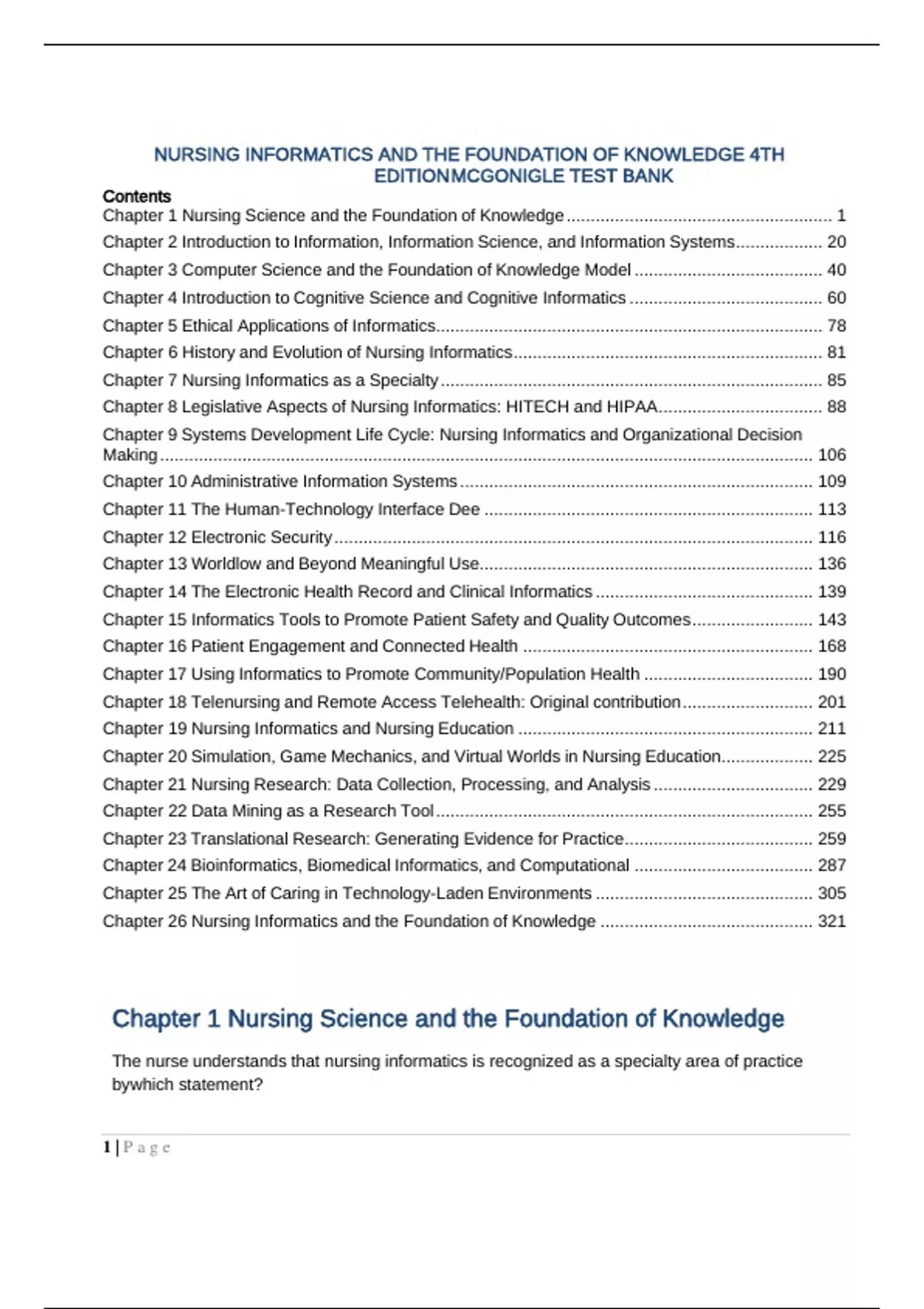 TEST BANK NURSING INFORMATICS AND THE FOUNDATION OF KNOWLEDGE 4TH EDITION MCGONIGLEContents Chapter 1 Nursing Science and the Foundation of Knowledge ....................................................... 1 Chapter 2 Introduction to Information, Information Science, and Information Systems .................. 20 Chapter 3 Computer Science and the Foundation of Knowledge Model ....................................... 40 Chapter 4 Introduction to Cognitive Science and Cognitive Informatics ........................................ 60 Chapter 5 Ethical Applications of Informatics ................................................................................ 78 Chapter 6 History and Evolution of Nursing Informatics ................................................................ 81 Chapter 7 Nursing Informatics as a Specialty ............................................................................... 85 Chapter 8 Legislative Aspects of Nursing Informatics: HITECH and HIPAA .................................. 88 Chapter 9 Systems Development Life Cycle: Nursing Informatics and Organizational Decision Making ....................................................................................................................................... 106 Chapter 10 Administrative Information Systems ......................................................................... 109 Chapter 11 The Human-Technology Interface Dee .................................................................... 113 Chapter 12 Electronic Security ................................................................................................... 116 Chapter 13 Worldlow and Beyond Meaningful Use..................................................................... 136 Chapter 14 The Electronic Health Record and Clinical Informatics ............................................. 139 Chapter 15 Informatics Tools to Promote Patient Safety and Quality Outcomes ......................... 143 Chapter 16 Patient Engagement and Connected Health ............................................................ 168 Chapter 17 Using Informatics to Promote Community/Population Health ................................... 190 Chapter 18 Telenursing and Remote Access Telehealth: Original contribution ........................... 201 Chapter 19 Nursing Informatics and Nursing Education ............................................................. 211 Chapter 20 Simulation, Game Mechanics, and Virtual Worlds in Nursing Education ................... 225 Chapter 21 Nursing Research: Data Collection, Processing, and Analysis ................................. 229 Chapter 22 Data Mining as a Research Tool .............................................................................. 255 Chapter 23 Translational Research: Generating Evidence for Practice ....................................... 259 Chapter 24 Bioinformatics, Biomedical Informatics, and Computational ..................................... 287 Chapter 25 The Art of Caring in Technology-Laden Environments ............................................. 305 Chapter 26 Nursing Informatics and the Foundation of Knowledge ............................................ 321 Chapter 1 Nursing Science and the Foundation of Knowledge The nurse understands that nursing informatics is recognized as a specialty area of practice by which statement? 1 | P a g e1. Research priorities for nursing informatics include the development of a standard nursing language and the development of databases for clinical information. 2. A formal educational program at the master's level must be completed before a nurse is eligible to sit for the credentialing examination. 3. As a differentiated practice, nursing informatics is focused upon the client, the environment, health, and the nurse. 4. There is a need for nursing informatics interests to gain representation by work groups and organizations within the United States. Correct Answer: 1 Rationale 1: The development of research priorities is a key point in a specialty practice. Although degrees at the master's level are available, the degree required for credentialing is typically at the bachelor's level and includes experience in the field. Current demands for safer, cost-effective, quality care require evidence of the best practices supported by research. Rationale 2: Such a formal educational program does not necessarily mean a specialty area of practice. Although degrees at the master's level are available, the degree required for credentialing is typically at the bachelor's level and includes experience in the field. The development of research priorities is a key point in a specialty practice. Rationale 3: Your chosen response refers to the entire discipline of nursing. The specialty of nursing informatics integrates nursing science, computer science, and information science to manage and communicate data, information, knowledge, and wisdom into nursing practice. The development of research priorities is a key point in a specialty practice. Rationale 4: There are many work groups in the United States related to informatics that focus on the specialty of informatics practice. One example is the Nursing Informatics Special Interest Group of the International Medical Informatics Association. The development of research priorities is a key point in a specialty practice. Global Rationale: Cognitive Level: Understanding Client Need: Safe Effective Care Environment Client Need Sub: Management of Care Nursing/Integrated Concepts: Nursing Process: Assessment Learning Outcome: Question 2 Type: MCSA Which statement by the nurse verifies that the nurse is "information literate"? 1. "I understand how to search for a website and evaluate its usefulness for health care needs." 2. "I utilize databases in the health care setting to input client information such as skin condition." 2 | P a g e3. "I use email over the Internet to correspond with clients and provide information." 4. "I can