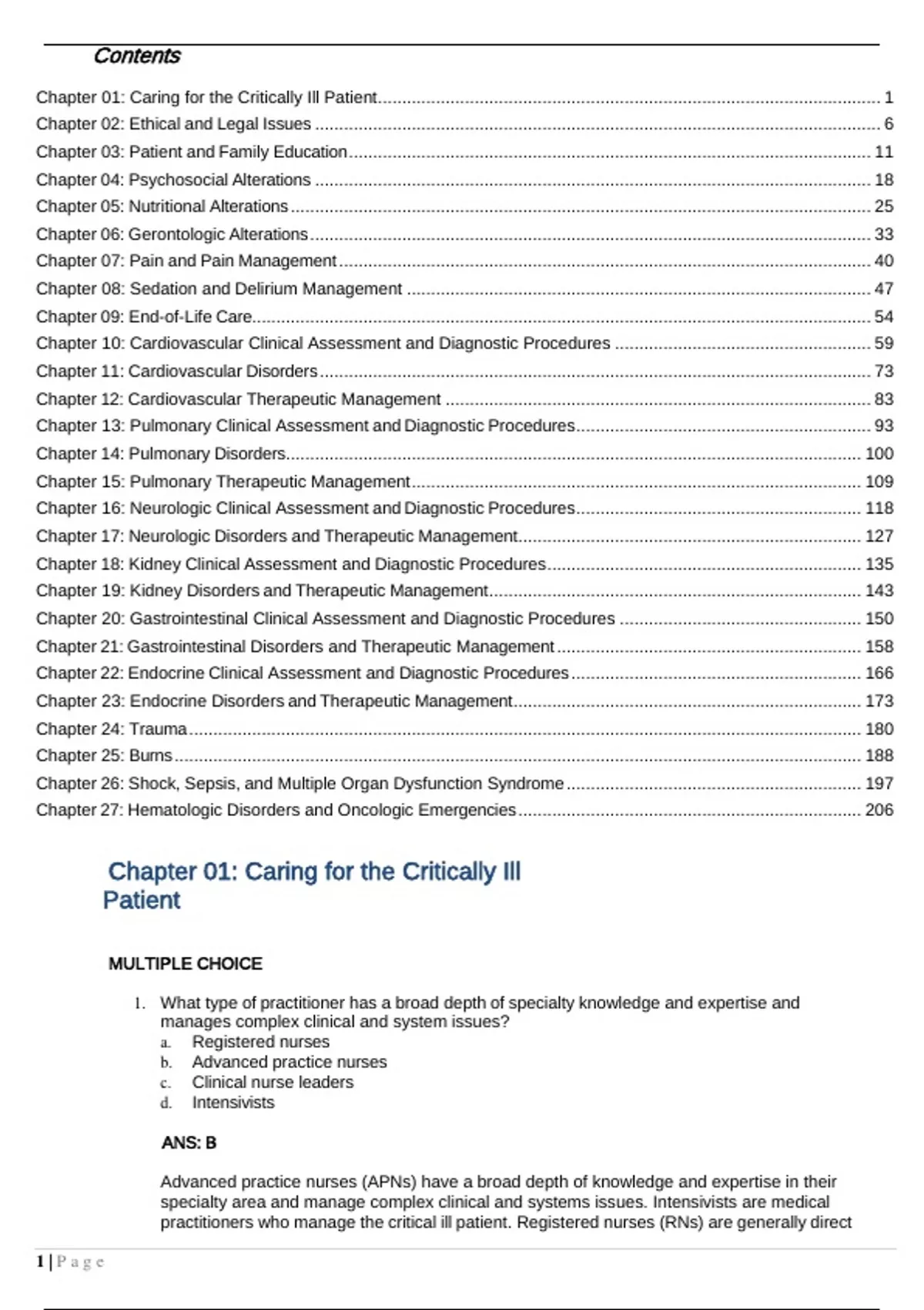 Test Bank Priorities in Critical Care Nursing 8th edition Urden Stacy LoughContents Chapter 01: Caring for the Critically Ill Patient ........................................................................................................ 1 Chapter 02: Ethical and Legal Issues ..................................................................................................................... 6 Chapter 03: Patient and Family Education ............................................................................................................ 11 Chapter 04: Psychosocial Alterations ................................................................................................................... 18 Chapter 05: Nutritional Alterations ........................................................................................................................ 25 Chapter 06: Gerontologic Alterations .................................................................................................................... 33 Chapter 07: Pain and Pain Management .............................................................................................................. 40 Chapter 08: Sedation and Delirium Management ................................................................................................ 47 Chapter 09: End-of-Life Care................................................................................................................................ 54 Chapter 10: Cardiovascular Clinical Assessment and Diagnostic Procedures ..................................................... 59 Chapter 11: Cardiovascular Disorders .................................................................................................................. 73 Chapter 12: Cardiovascular Therapeutic Management ........................................................................................ 83 Chapter 13: Pulmonary Clinical Assessment and Diagnostic Procedures ............................................................. 93 Chapter 14: Pulmonary Disorders....................................................................................................................... 100 Chapter 15: Pulmonary Therapeutic Management ............................................................................................. 109 Chapter 16: Neurologic Clinical Assessment and Diagnostic Procedures ........................................................... 118 Chapter 17: Neurologic Disorders and Therapeutic Management ....................................................................... 127 Chapter 18: Kidney Clinical Assessment and Diagnostic Procedures ................................................................. 135 Chapter 19: Kidney Disorders and Therapeutic Management ............................................................................. 143 Chapter 20: Gastrointestinal Clinical Assessment and Diagnostic Procedures .................................................. 150 Chapter 21: Gastrointestinal Disorders and Therapeutic Management ............................................................... 158 Chapter 22: Endocrine Clinical Assessment and Diagnostic Procedures ............................................................ 166 Chapter 23: Endocrine Disorders and Therapeutic Management ........................................................................ 173 Chapter 24: Trauma ........................................................................................................................................... 180 Chapter 25: Burns .............................................................................................................................................. 188 Chapter 26: Shock, Sepsis, and Multiple Organ Dysfunction Syndrome ............................................................. 197 Chapter 27: Hematologic Disorders and Oncologic Emergencies ....................................................................... 206 Chapter 01: Caring for the Critically Ill Patient MULTIPLE CHOICE 1. What type of practitioner has a broad depth of specialty knowledge and expertise and manages complex clinical and system issues? a. Registered nurses b. Advanced practice nurses c. Clinical nurse leaders d. Intensivists ANS: B Advanced practice nurses (APNs) have a broad depth of knowledge and expertise in their specialty area and manage complex clinical and systems issues. Intensivists are medical practitioners who manage the critical ill patient. Registered nurses (RNs) are generally direct 1 | P a g ecare providers. Clinical nurse leaders (CNLs) generally do not manage system issues. PTS: 1 DIF: Cognitive Level: Remembering OBJ: Nursing Process Step: N/A TOP: Caring for the Critically Ill Patient MSC: NCLEX: Safe and Effective Care Environment: Coordinated Care 2. What type of practitioner is instrumental in ensuring care that is evidence based and that safety programs are in place? a. Clinical nurse specialist b. Advanced practice nurse c. Registered nurses d. Nurse practitioners ANS: A Clinical nurse specialists (CNSs) serve in specialty roles that use their clinical, teaching, research, leadership, and consultative abilities. They are instrumental in ensuring that care is evidence based and that safety programs are in place. Advanced practice nurses (APNs) have a broad depth of knowledge and expertise in their specialty area and manage complex clinical and systems issues. Registered nurses are generally direct care providers. Nurse practitioners (NPs) manage direct clinical care of groups of patients. PTS: 1 Remembering DIF: Cognitive Level: OBJ: Nursing Process Step: N/A TOP: Caring for the Critically Ill Patient MSC: NCLEX: Safe and Effective Care Environment: Coordinated Care 3. Which professional organization administers critical care certification exams for registered nurses? a. State Board of Registered Nurses b. National Association of Clinical Nurse Specialist c. Society of 