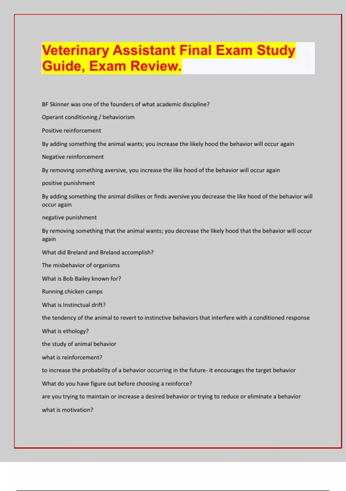 Veterinary Assistant Final Exam Study Guide, Exam Review. BF Skinner was one of the founders of what academic discipline? Operant conditioning / behaviorism Positive reinforcement By adding something the animal wants; you increase the likely hood the behavior will occur again Negative reinforcement By removing something aversive, you increase the like hood of the behavior will occur again positive punishment By adding something the animal dislikes or finds aversive you decrease the like hood of the behavior will occur again negative punishment By removing something that the animal wants; you decrease the likely hood that the behavior will occur again What did Breland and Breland accomplish