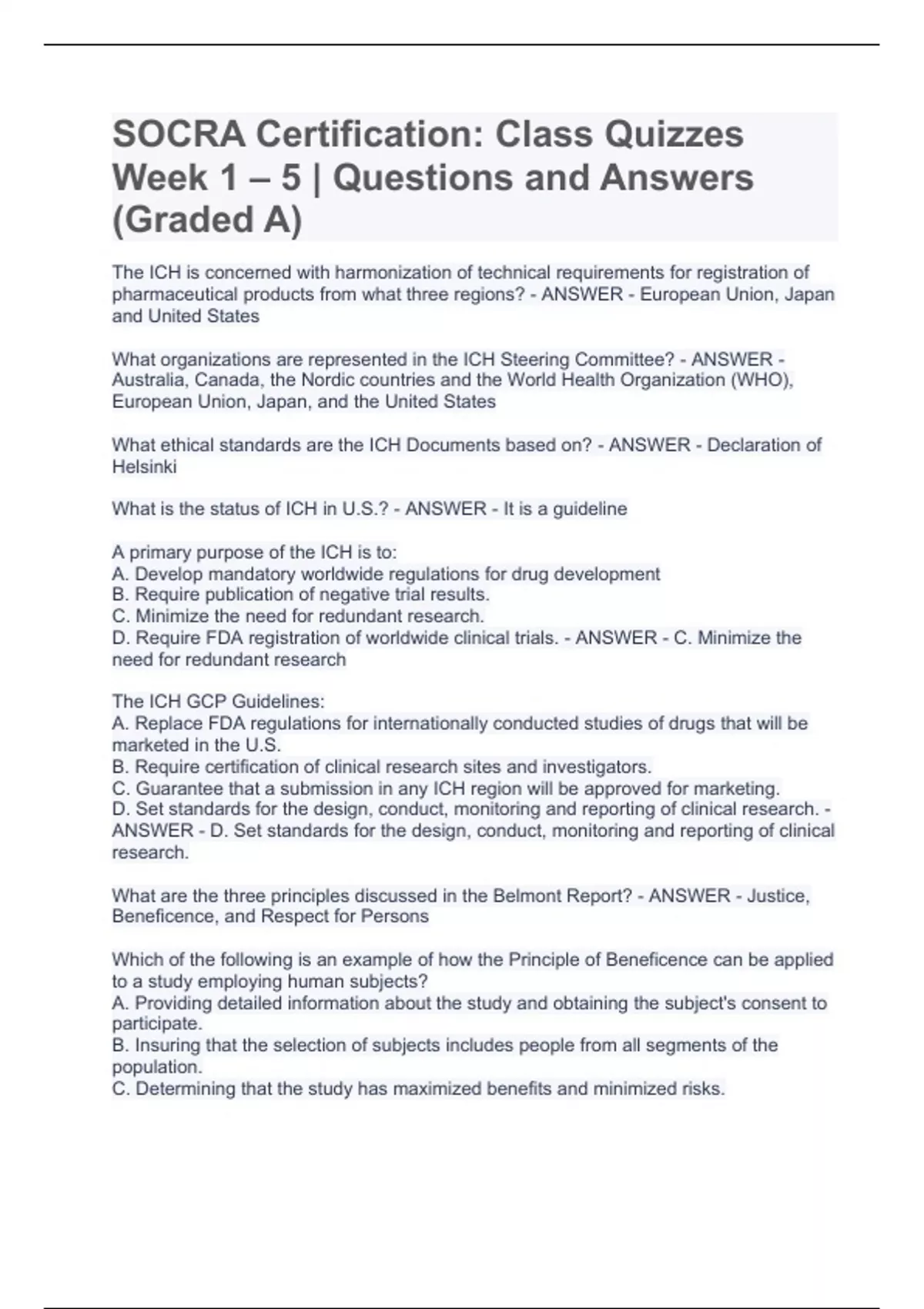 SOCRA Certification: Class Quizzes Week 1 – 5 | Questions and Answers (Graded A)SOCRA Certification: Class Quizzes Week 1 – 5 | Questions and Answers (Graded A)SOCRA Certification: Class Quizzes Week 1 – 5 | Questions and Answers (Graded A) The ICH is concerned with harmonization of technical requirements for registration of pharmaceutical products from what three regions? - ANSWER - European Union, Japan and United States What organizations are represented in the ICH Steering Committee? - ANSWER - Australia, Canada, the Nordic countries and the World Health Organization (WHO), European Union, Japan, and the United States What ethical standards are the ICH Documents based on? - ANSWER - Declaration of Helsinki
