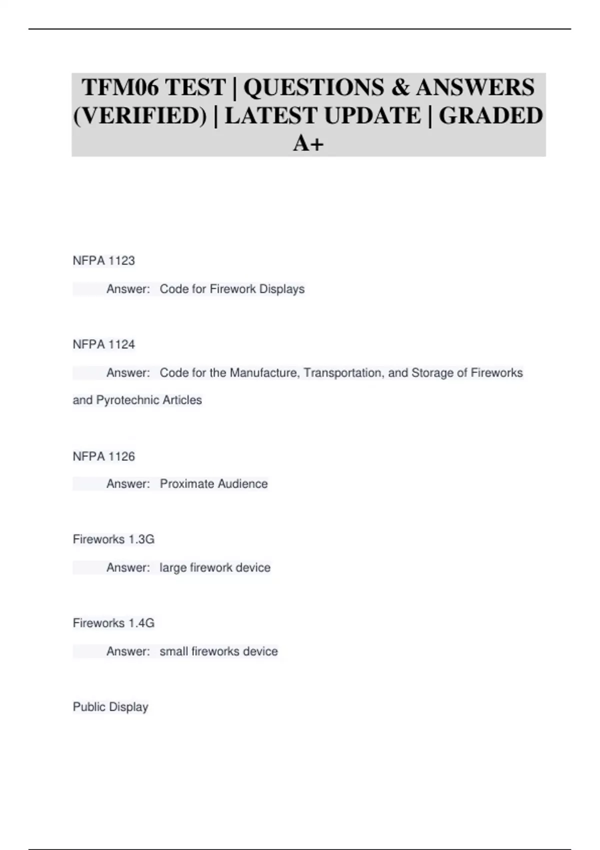 NFPA 1123 Answer: Code for Firework Displays NFPA 1124 Answer: Code for the Manufacture, Transportation, and Storage of Fireworks and Pyrotechnic Articles NFPA 1126 Answer: Proximate Audience Fireworks 1.3G Answer: large firework device Fireworks 1.4G Answer: small fireworks device Public Display