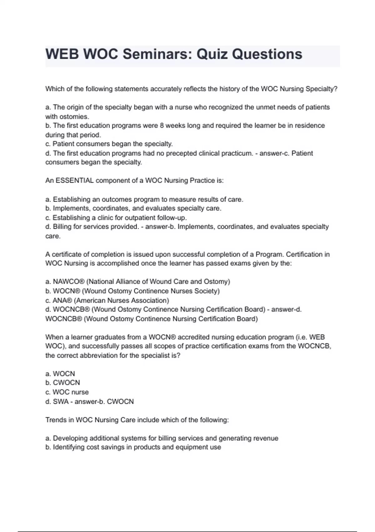 WEB WOC Seminars: Quiz Questions with actual answers 2024 Which of the following statements accurately reflects the history of the WOC Nursing Specialty? a. The origin of the specialty began with a nurse who recognized the unmet needs of patients with ostomies. b. The first education programs were 8 weeks long and required the learner be in residence during that period. c. Patient consumers began the specialty. d. The first education programs had no precepted clinical practicum. - answer-c. Patient consumers began the specialty. An ESSENTIAL component of a WOC Nursing Practice is: a. Establishing an outcomes program to measure results of care. b. Implements, coordinates, and evaluates specialty care. c. Establishing a clinic for outpatient follow-up. d. Billing for services provided. - answer-b. Implements, coordinates, and evaluates specialty care. A certificate of completion is issued upon successful completion of a Program. Certification in WOC Nursing is accomplished once the learner has passed exams given by the: a. NAWCO® (National Alliance of Wound Care and Ostomy) b. WOCN® (Wound Ostomy Continence Nurses Society) c. ANA® (American Nurses