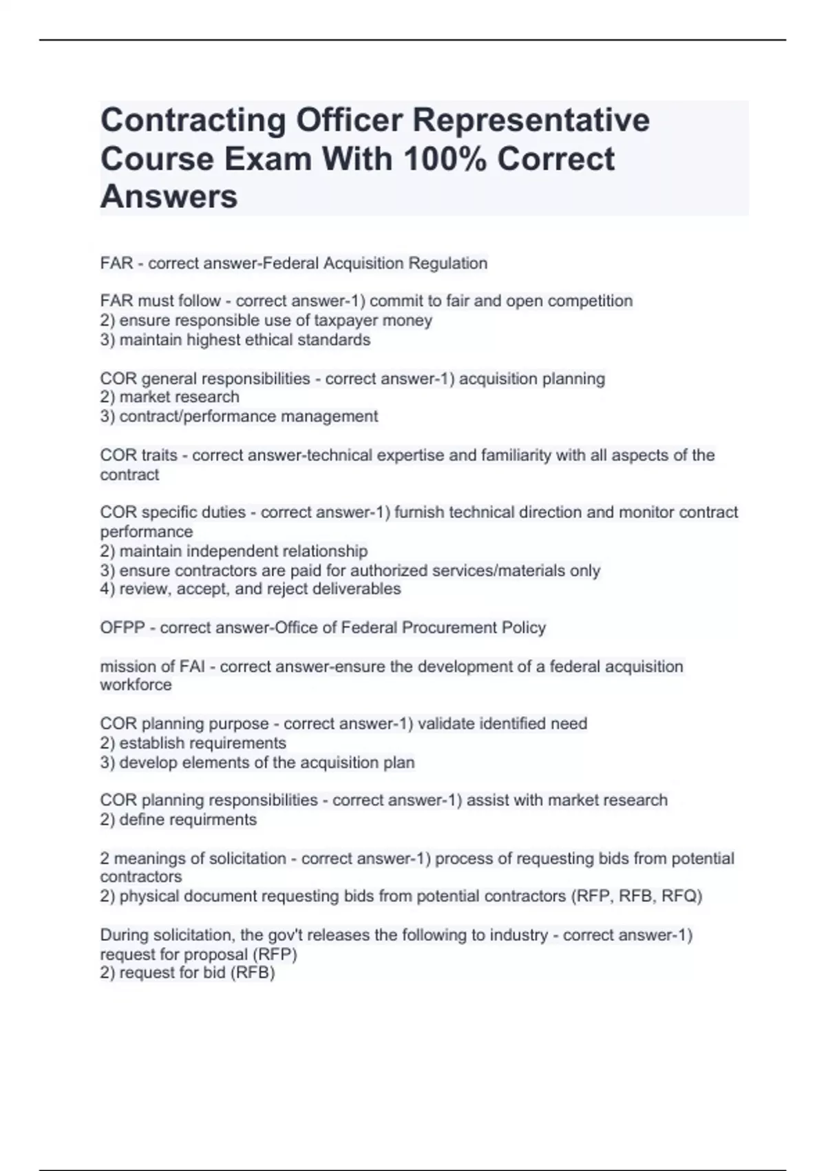 Contracting Officer Representative Course Exam With 100% Correct Answers