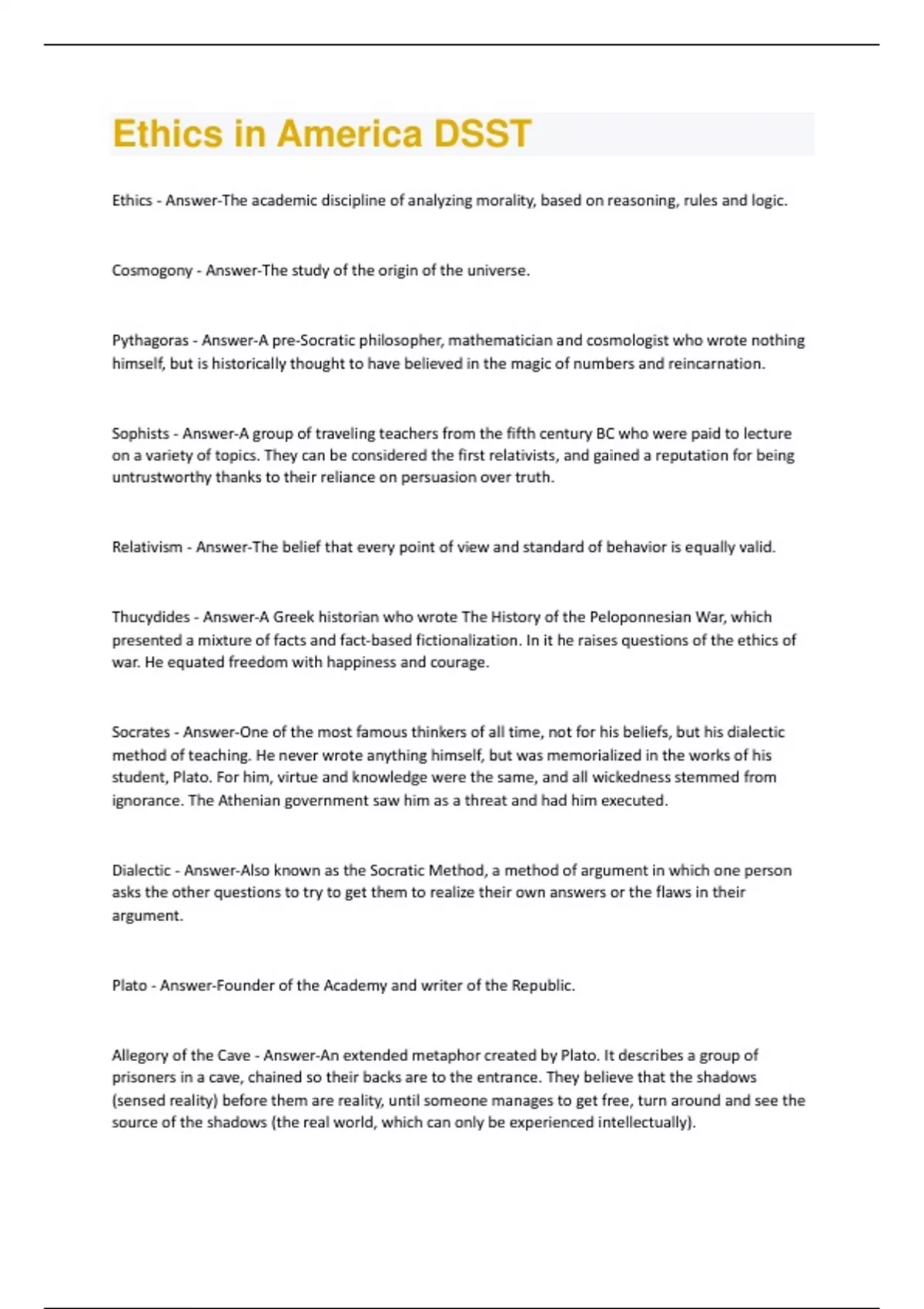 Ethics - Answer-The academic discipline of analyzing morality, based on reasoning, rules and logic. Cosmogony - Answer-The study of the origin of the universe. Pythagoras - Answer-A pre-Socratic philosopher, mathematician and cosmologist who wrote nothing himself, but is historically thought to have believed in the magic of numbers and reincarnation. Sophists - Answer-A group of traveling teachers from the fifth century BC who were paid to lecture on a variety of topics. They can be considered the first relativists, and gained a reputation for being untrustworthy thanks to their reliance on persuasion over truth. Relativism - Answer-The belief that every point of view and standard of behavior is equally valid. Thucydides - Answer-A Greek historian who wrote The History of the Peloponnesian War, which presented a mixture of facts and fact-based fictionalization. In it he raises questions of the ethics of war. He equated freedom with happiness and courage. Socrates - Answer-One of the most famous thinkers of all time, not for his beliefs, but his dialectic method of teaching. He never wrote anything himself, but was memorialized in the works of his student, Plato. For him, virtue and knowledge were the same, and all wickedness stemmed from ignorance. The Athenian government saw him as a threat and had him executed. Dialectic - Answer-Also known as the Socratic Method, a method of argument in which one person asks the other questions to try to get them to realize their own answers or the flaws in their argument. Plato - Answer-Founder of the Academy and writer of the Republic. Allegory of the Cave - Answer-An extended metaphor created by Plato. It describes a group of prisoners in a cave, chained so their backs are to the entrance. They believe that the shadows (sensed reality) before them are reality, until someone manages to get free, turn around and see the source of the shadows (the real world, which can only be experienced intellectually).Aristotle - Answer-A philosopher and Plato's student who concentrated on empirical knowledge. He believed that change is necessary and natural, and everything has a purpose. He wrote Nicomachean Ethics, and that balance was the key to happiness. Stoics - Answer-Followers of Zeno, Greeks who believed that absolute laws and destiny ruled the universe, and that since humans could not change fate, they were happiest when they simply accepted it and lived with self-control. Hedonists - Answer-Also known as Epicureans after their original teacher, these believed that happiness was the purpose of life, and anything that reduced pain and increased happiness was therefore good. Christianity - Answer-A religion founded by Jesus Christ, based on the Bible, that teaches that humanity is fallen and can only find salvation through faith in Christ and his substitutiary sacrifice. Judaism - Answer-The oldest monotheistic religion, it is based on the Old Testament or Hebrew Bible, and influenced both Christianity and Islam. It places emphasis on history, laws and religious community.