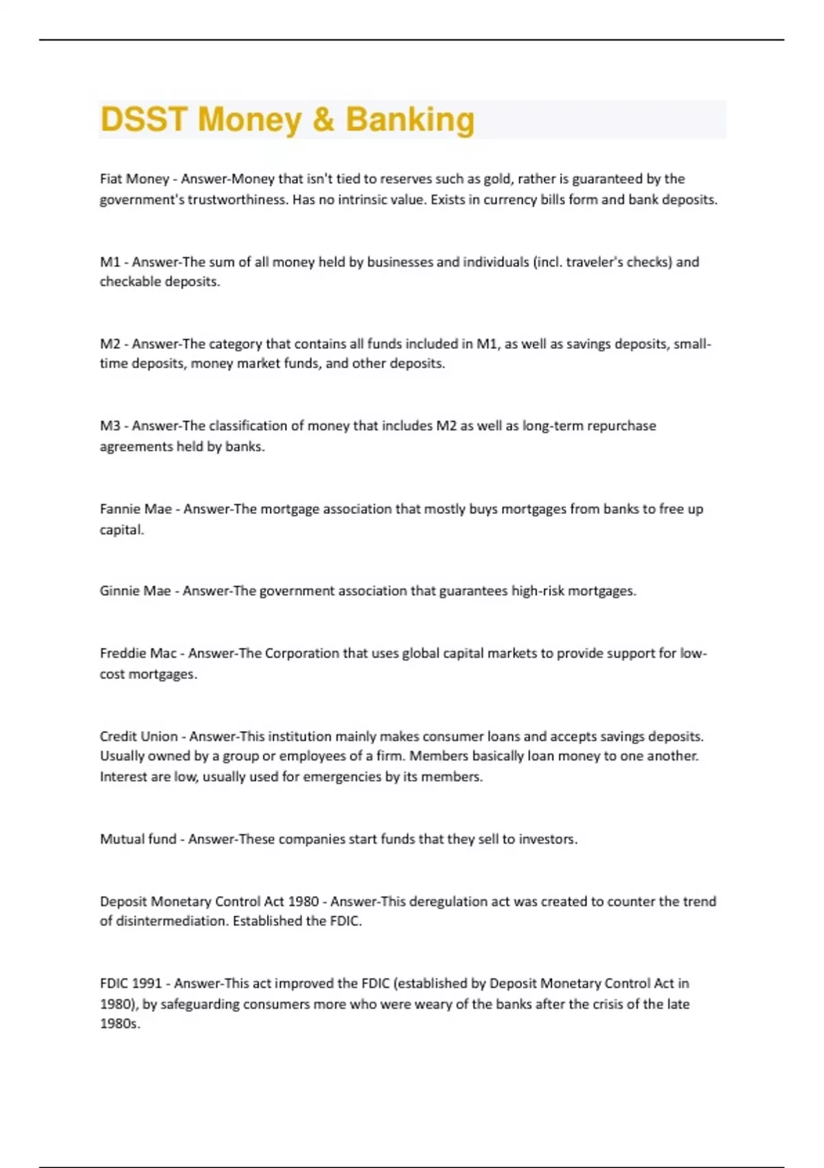 Fiat Money - Answer-Money that isn't tied to reserves such as gold, rather is guaranteed by the government's trustworthiness. Has no intrinsic value. Exists in currency bills form and bank deposits. M1 - Answer-The sum of all money held by businesses and individuals (incl. traveler's checks) and checkable deposits. M2 - Answer-The category that contains all funds included in M1, as well as savings deposits, smalltime deposits, money market funds, and other deposits. M3 - Answer-The classification of money that includes M2 as well as long-term repurchase agreements held by banks. Fannie Mae - Answer-The mortgage association that mostly buys mortgages from banks to free up capital. Ginnie Mae - Answer-The government association that guarantees high-risk mortgages. Freddie Mac - Answer-The Corporation that uses global capital markets to provide support for lowcost mortgages. Credit Union - Answer-This institution mainly makes consumer loans and accepts savings deposits. Usually owned by a group or employees of a firm. Members basically loan money to one another. Interest are low, usually used for emergencies by its members. Mutual fund - Answer-These companies start funds that they sell to investors. Deposit Monetary Control Act 1980 - Answer-This deregulation act was created to counter the trend of disintermediation. Established the FDIC. FDIC 1991 - Answer-This act improved the FDIC (established by Deposit Monetary Control Act in 1980), by safeguarding consumers more who were weary of the banks after the crisis of the late 1980s.Demand deposits - Answer-These deposits can be withdrawn immediately at the discretion of the depositor (e.g. checking account). Do not bear interest. M1 includes these deposits. Money Market Funds - Answer-An institution that sells shares and uses the money from the sale to purchase assets. The value of these funds is included in the M2 definition of money. Federal Reserve (/Central Bank System) - Answer-The National Monetary Commission established this system in 1908 to investigate the country's monetary policy. The members on the Board of Governors serve 14-year terms. The advisory council has 12 members (one from each district) and each serve 3 one-year terms. Stagflation - Answer-This occurs when very little economic growth and rising inflation is happening. During such periods, output stalls and unemployment is high.