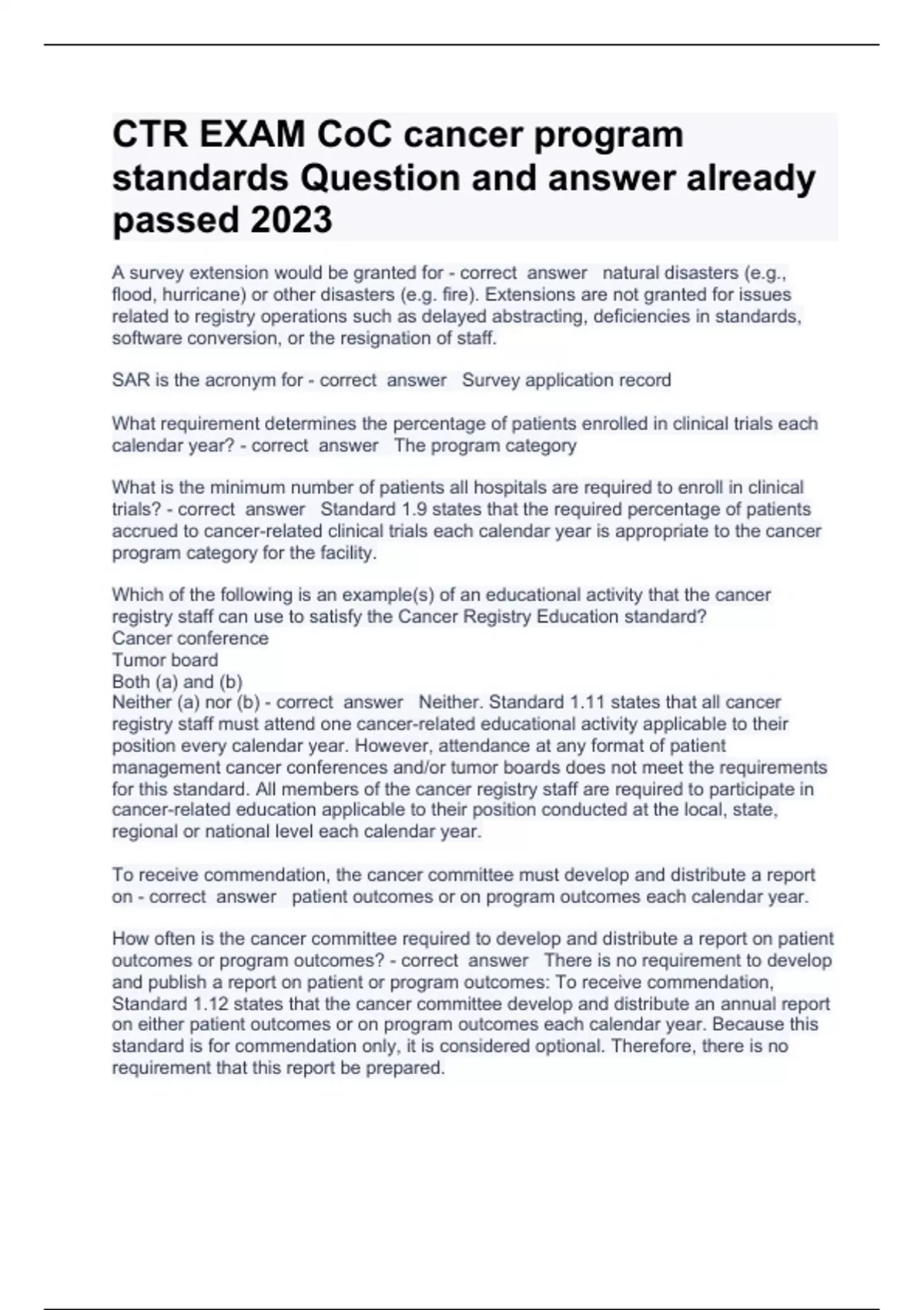 CTR EXAM CoC cancer program standards Question and CERTIFIED READY answer already passed 2023/2024 A survey extension would be granted for - correct answer natural disasters (e.g., flood, hurricane) or other disasters (e.g. fire). Extensions are not granted for issues related to registry operations such as delayed abstracting, deficiencies in standards, software conversion, or the resignation of staff. SAR is the acronym for - correct answer Survey application record What requirement determines the percentage of patients enrolled in clinical trials each calendar year? - correct answer The program category What is the minimum number of patients all hospitals are required to enroll in clinical trials? - correct answer Standard 1.9 states that the required percentage of patients accrued to cancer-related clinical trials each calendar year is appropriate to the cancer program category for the facility. Which of the following is an example(s) of an educational activity that the cancer registry staff can use to satisfy the Cancer Registry Education standard? Cancer conference Tumor board Both (a) and (b) Neither (a) nor (b) - correct answer Neither. Standard 1.11 states that all cancer registry staff must attend one cancer-related educational activity applicable to their position every calendar year. However, attendance at any format of patient management cancer conferences and/or tumor boards does not meet the requirements for this standard. All members of the cancer registry staff are required to participate in cancer-related education applicable to their position conducted at the local, state, regional or national level each calendar year. To receive commendation, the cancer committee must develop and distribute a report on - correct answer patient outcomes or on program outcomes each calendar year. How often is the cancer committee required to develop and distribute a report on patient outcomes or program outcomes? - correct answer There is no requirement to develop and publish a report on patient or program outcomes: To receive commendation, Standard 1.12 states that the cancer committee develop and distribute an annual report on either patient outcomes or on program outcomes each calendar year. Because this standard is for commendation only, it is considered optional. Therefore, there is no requirement that this report be prepared. To receive commendation, when the cancer committee completes its report on either patient outcomes or program outcomes, it is required to distribute the report to - correct answer The public; For commendation, Standard 1.12 requires that the cancer committee develop and distribute a report to the public on either patient outcomes or on program outcomes. Nurses who care for cancer patients must - correct answer Have specialized knowledge and skills in oncology nursing. note: Standard 2.2 requires that oncology nursing care be provided by nurses with specialized knowledge and skills. Oncology nurse certification, while not required, is strongly encouraged How often must the competency of oncology nurses be evaluated? - correct answer Year: Standard 2.2 requires that the competency of oncology nurses be evaluated each calendar year. Cancer conference prospective cases include - correct answer Patients who were previously presented at a cancer conference if there is a need to discuss systemic treatment for disease progression following the completion of first course of treatment and Patients who were previously diagnosed if there is a need to discuss palliative care options. Eligibility requirement ER3 states that Patients previously presented at cancer conference who completed initial therapy but now need adjuvant treatment or treatment for recurrence or progression of disease, as well as those who require supportive or palliative care.