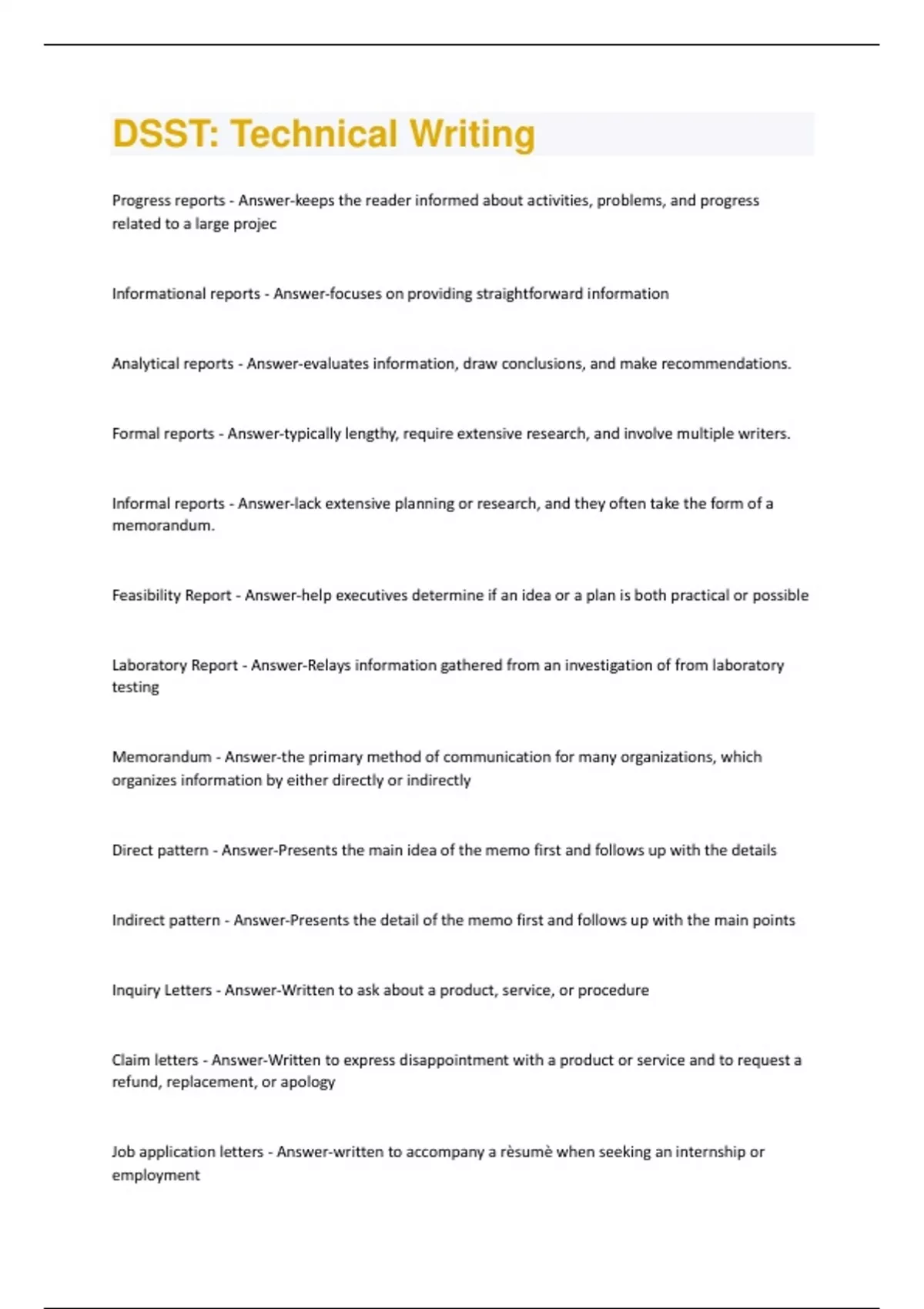 Progress reports - Answer-keeps the reader informed about activities, problems, and progress related to a large projec Informational reports - Answer-focuses on providing straightforward information Analytical reports - Answer-evaluates information, draw conclusions, and make recommendations. Formal reports - Answer-typically lengthy, require extensive research, and involve multiple writers. Informal reports - Answer-lack extensive planning or research, and they often take the form of a memorandum. Feasibility Report - Answer-help executives determine if an idea or a plan is both practical or possible Laboratory Report - Answer-Relays information gathered from an investigation of from laboratory testing Memorandum - Answer-the primary method of communication for many organizations, which organizes information by either directly or indirectly Direct pattern - Answer-Presents the main idea of the memo first and follows up with the details Indirect pattern - Answer-Presents the detail of the memo first and follows up with the main points Inquiry Letters - Answer-Written to ask about a product, service, or procedure Claim letters - Answer-Written to express disappointment with a product or service and to request a refund, replacement, or apology Job application letters - Answer-written to accompany a rèsumè when seeking an internship or employmentResume - Answer-serves as an important tool for illustrating qualification to potential employment user manuals - Answer-written for both skilled or unskilled users of product