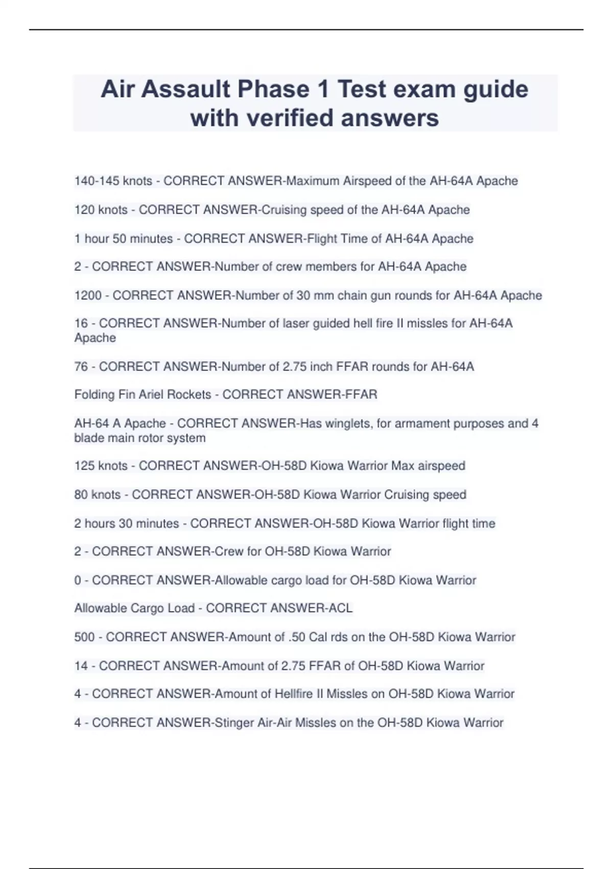 Air Assault Phase 1 Test exam guide with verified answers 140-145 knots - CORRECT ANSWER-Maximum Airspeed of the AH-64A Apache 120 knots - CORRECT ANSWER-Cruising speed of the AH-64A Apache 1 hour 50 minutes - CORRECT ANSWER-Flight Time of AH-64A Apache 2 - CORRECT ANSWER-Number of crew members for AH-64A Apache 1200 - CORRECT ANSWER-Number of 30 mm chain gun rounds for AH-64A Apache 16 - CORRECT ANSWER-Number of laser guided hell fire II missles for AH-64A Apache 76 - CORRECT ANSWER-Number of 2.75 inch FFAR rounds for AH-64A Folding Fin Ariel Rockets - CORRECT ANSWER-FFAR AH-64 A Apache - CORRECT ANSWER-Has winglets, for armament purposes and 4 blade main rotor system 125 knots - CORRECT ANSWER-OH-58D Kiowa Warrior Max airspeed 80 knots - CORRECT ANSWER-OH-58D Kiowa Warrior Cruising speed 2 hours 30 minutes - CORRECT ANSWER-OH-58D Kiowa Warrior flight time 2 - CORRECT ANSWER-Crew for OH-58D Kiowa Warrior 0 - CORRECT ANSWER-Allowable cargo load for OH-58D Kiowa Warrior Allowable Cargo Load - CORRECT ANSWER-ACL 500 - CORRECT ANSWER-Amount of .50 Cal rds on the OH-58D Kiowa Warrior 14 - CORRECT ANSWER-Amount of 2.75 FFAR of OH-58D Kiowa Warrior 4 - CORRECT ANSWER-Amount of Hellfire II Missles on OH-58D Kiowa Warrior 4 - CORRECT ANSWER-Stinger Air-Air Missles on the OH-58D Kiowa Warrior