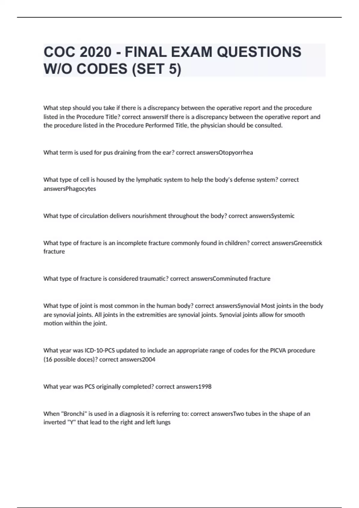 What step should you take if there is a discrepancy between the operative report and the procedure listed in the Procedure Title? correct answersIf there is a discrepancy between the operative report and the procedure listed in the Procedure Performed Title, the physician should be consulted. What term is used for pus draining from the ear? correct answersOtopyorrhea What type of cell is housed by the lymphatic system to help the body's defense system? correct answersPhagocytes What type of circulation delivers nourishment throughout the body? correct answersSystemic What type of fracture is an incomplete fracture commonly found in children? correct answersGreenstick fracture What type of fracture is considered traumatic? correct answersComminuted fracture What type of joint is most common in the human body? correct answersSynovial Most joints in the body are synovial joints. All joints in the extremities are synovial joints. Synovial joints allow for smooth motion within the joint. What year was ICD-10-PCS updated to include an appropriate range of codes for the PICVA procedure (16 possible doces)? correct answers2004 What year was PCS originally completed? correct answers1998 When "Bronchi" is used in a diagnosis it is referring to: correct answersTwo tubes in the shape of an inverted "Y" that lead to the right and left lungs