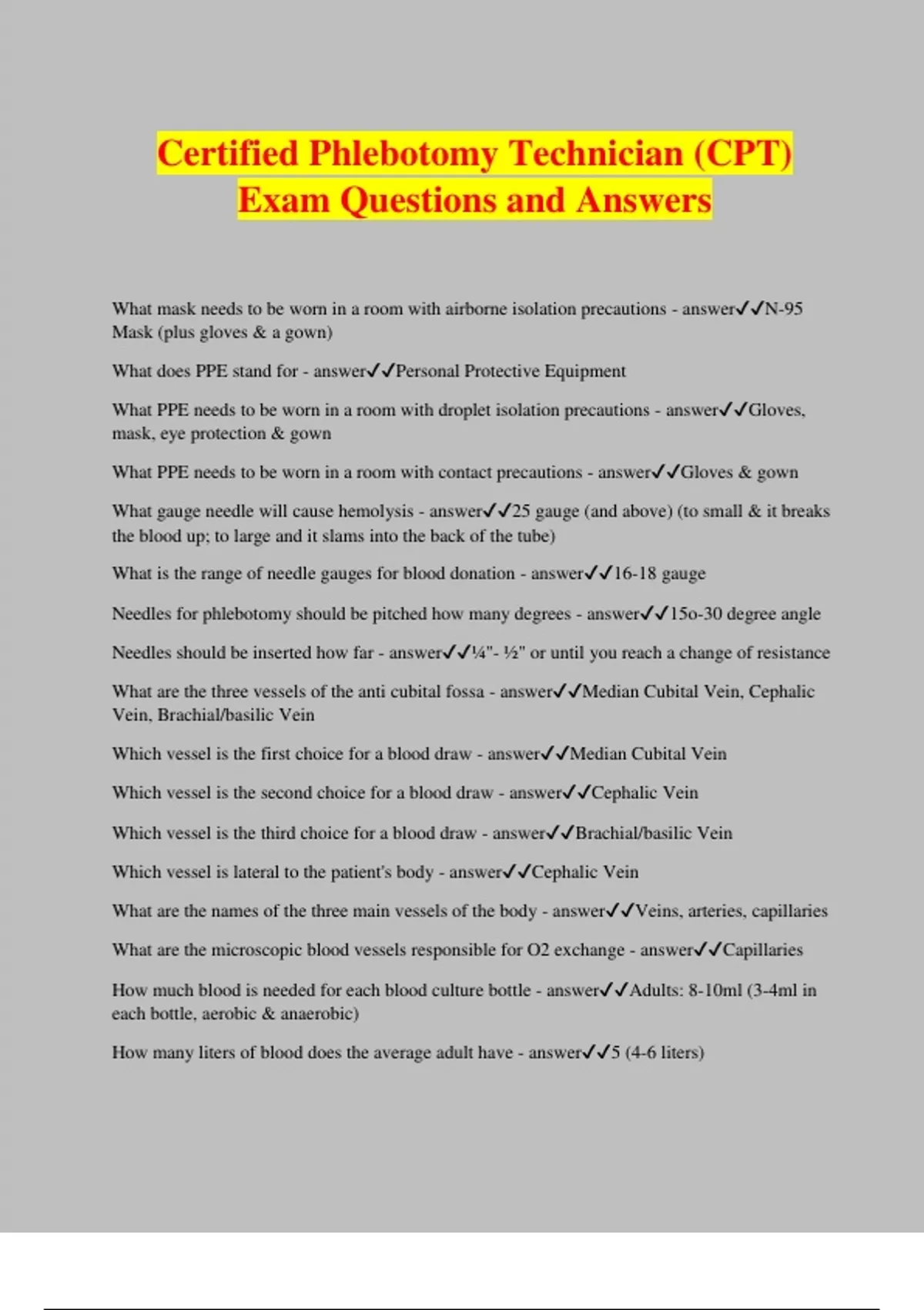 Certified Phlebotomy Technician (CPT) Exam Questions and Answers What mask needs to be worn in a room with airborne isolation precautions - answerN-95 Mask (plus gloves & a gown) What does PPE stand for - answerPersonal Protective Equipment What PPE needs to be worn in a room with droplet isolation precautions - answerGloves, mask, eye protection & gown What PPE needs to be worn in a room with contact precautions - answerGloves & gown What gauge needle will cause hemolysis - answer25 gauge (and above) (to small & it breaks the blood up; to large and it slams into the back of the tube) What is the range of needle gauges for blood donation - answer16-18 gauge Needles for phlebotomy should be pitched how many degrees - answer15o-30 degree angle Needles should be inserted how far - answer¼"- ½" or until you reach a change of resistance What are the three vessels of the anti cubital fossa - answerMedian Cubital Vein, Cephalic Vein, Brachial/basilic Vein Which vessel is the first choice for a blood draw - answerMedian Cubital Vein Which vessel is the second choice for a blood draw - answerCephalic Vein Which vessel is the third choice for a blood draw - answerBrachial/basilic Vein Which vessel is lateral to the patient's body - answerCephalic Vein What are the names of the three main vessels of the body - answerVeins, arteries, capillaries What are the microscopic blood vessels responsible for O2 exchange - answerCapillaries How much blood is needed for each blood culture bottle - answerAdults: 8-10ml (3-4ml in each bottle, aerobic & anaerobic) How many liters of blood does the average adult have - answer5 (4-6 liters)