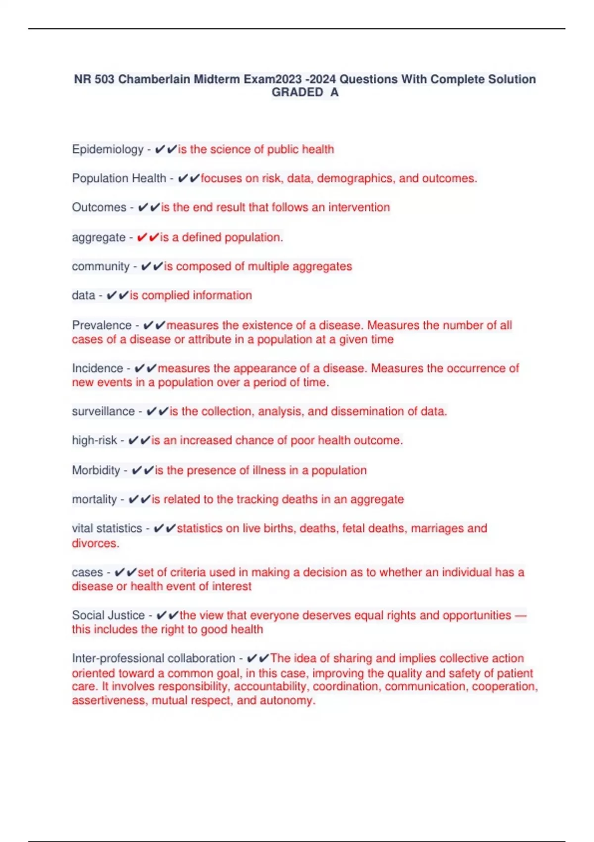 Population Health - ✔✔focuses on risk, data, demographics, and outcomes.
