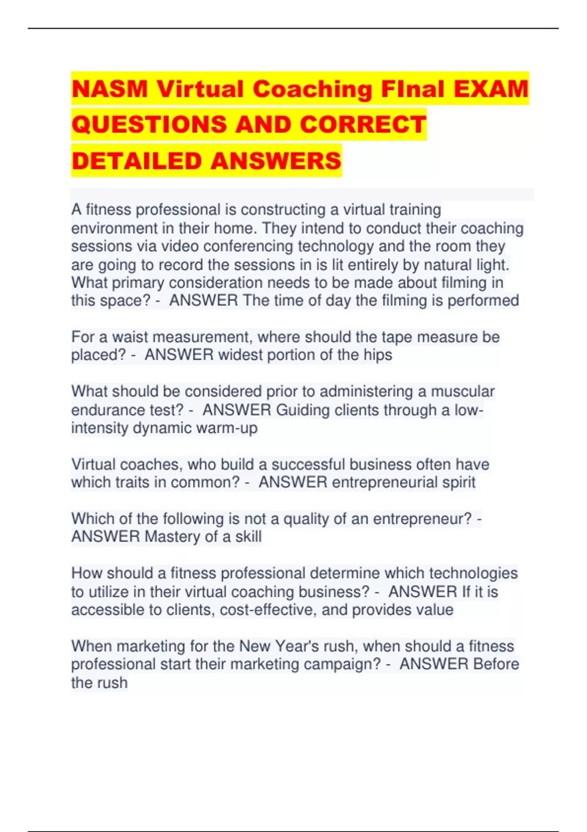 NASM Virtual Coaching FInal EXAM QUESTIONS AND CORRECT DETAILED ANSWERS A fitness professional is constructing a virtual training environment in their home. They intend to conduct their coaching sessions via video conferencing technology and the room they are going to record the sessions in is lit entirely by natural light. What primary consideration needs to be made about filming in this space? - ANSWER The time of day the filming is performed For a waist measurement, where should the tape measure be placed? - ANSWER widest portion of the hips What should be considered prior to administering a muscular endurance test? - ANSWER Guiding clients through a lowintensity dynamic warm-up Virtual coaches, who build a successful business often have which traits in common? - ANSWER entrepreneurial spirit Which of the following is not a quality of an entrepreneur? - ANSWER Mastery of a skill How should a fitness professional determine which technologies to utilize in their virtual coaching business? - ANSWER If it is accessible to clients, cost-effective, and provides value When marketing for the New Year's rush, when should a fitness professional start their marketing campaign? - ANSWER Before the rush While performing a SWOT analysis on the business, a fitness professional realizes that they do not know how to set up a virtual training session on their lapton. This lack of technical knowledge would fall under what catergory of a SWOT analysis? - ANSWER Weakness What is the normal range for resting oxygen saturation in healthy adults? - ANSWER 95 to 100% How should heart rate variability be evaluated to asses training readiness and outcomes in a virtual coaching environment? - ANSWER Asses for positive or negative change at the individual level What are features of a product? - ANSWER Features are descriptions of what a product or service offers customers Approximately what percentage of U.S adults regularly wear a smartwatch or wearable fitness tracker? - ANSWER 21% When a wearable device is not available, what additional resources may be utilized to perform a reliable resting heart rate assessment? - ANSWER Video Camera Which of the following is an effect of sleep deprivation? - ANSWER Increase testosterone What are some advantages of using technology for virtual assessments? - ANSWER Expedite and expand the range of assessments and improve data reliability and interpretation. When are wearable fitness trackers most accurate for accounting for calorie expenditure? - ANSWER At rest Fitness and recreation centers are expected to grow by what percent by 2028? - ANSWER 15% Which of the following appointment confirmation time frames would be the most appropriate for a cancellation policy? - ANSWER 12 to 24 hour prior What is the first step in automating the prospecting process? - ANSWER Ensure the target market is well-defined According to the Consumer Emotional Intelligence Sale, Which three emotional factors impact a consumer's purchasing decisions? - ANSWER Self-concept connection, emotional attachment, brand love According to the World Health Organization, abdominal obesity is defined as a waist-to-hip ratio above what in females? - ANSWER 0.85