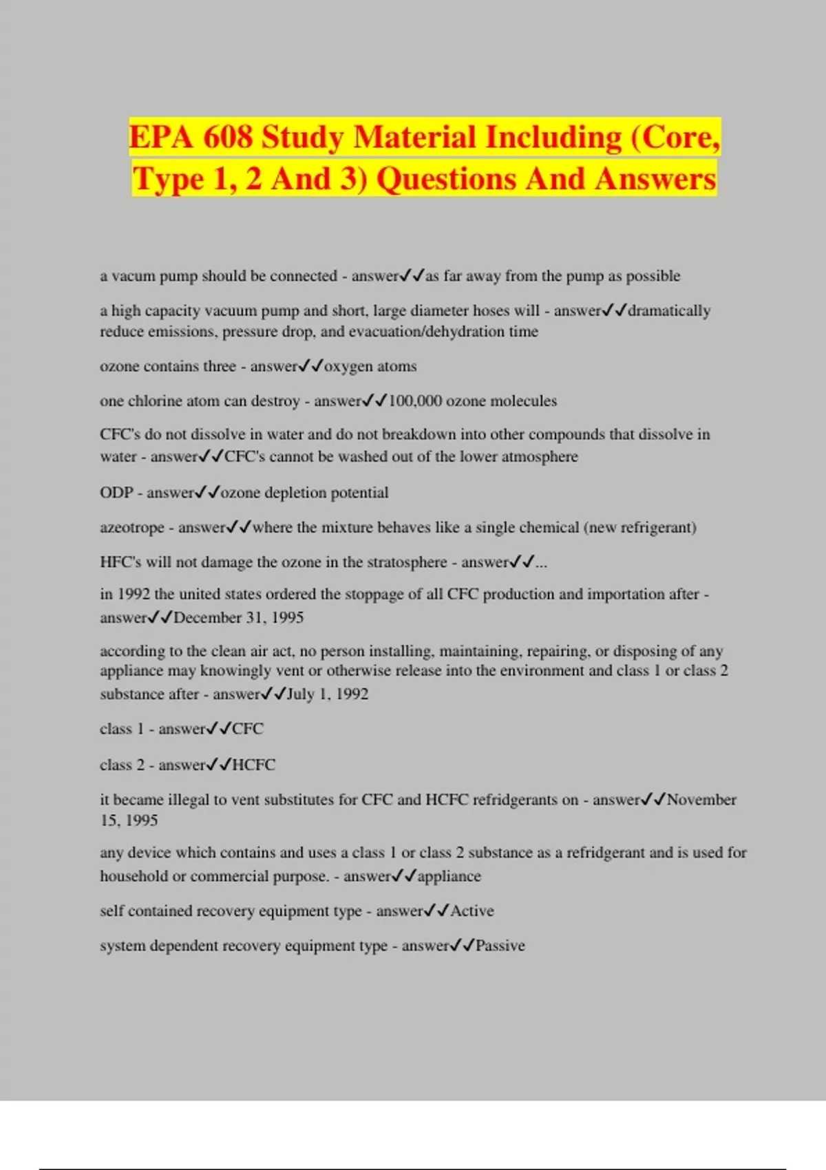 EPA 608 Study Material Including (Core, Type 1, 2 And 3) Questions And Answers a vacum pump should be connected - answeras far away from the pump as possible a high capacity vacuum pump and short, large diameter hoses will - answerdramatically reduce emissions, pressure drop, and evacuation/dehydration time ozone contains three - answeroxygen atoms one chlorine atom can destroy - answer100,000 ozone molecules CFC's do not dissolve in water and do not breakdown into other compounds that dissolve in water - answerCFC's cannot be washed out of the lower atmosphere ODP - answerozone depletion potential azeotrope - answerwhere the mixture behaves like a single chemical (new refrigerant) HFC's will not damage the ozone in the stratosphere - answer... in 1992 the united states ordered the stoppage of all CFC production and importation after - answerDecember 31, 1995 according to the clean air act, no person installing, maintaining, repairing, or disposing of any appliance may knowingly vent or otherwise release into the environment and class 1 or class 2 substance after - answerJuly 1, 1992 class 1 - answerCFC class 2 - answerHCFC it became illegal to vent substitutes for CFC and HCFC refridgerants on - answerNovember 15, 1995 any device which contains and uses a class 1 or class 2 substance as a refridgerant and is used for household or commercial purpose. - answerappliance self contained recovery equipment type - answerActive system dependent recovery equipment type - answerPassive
