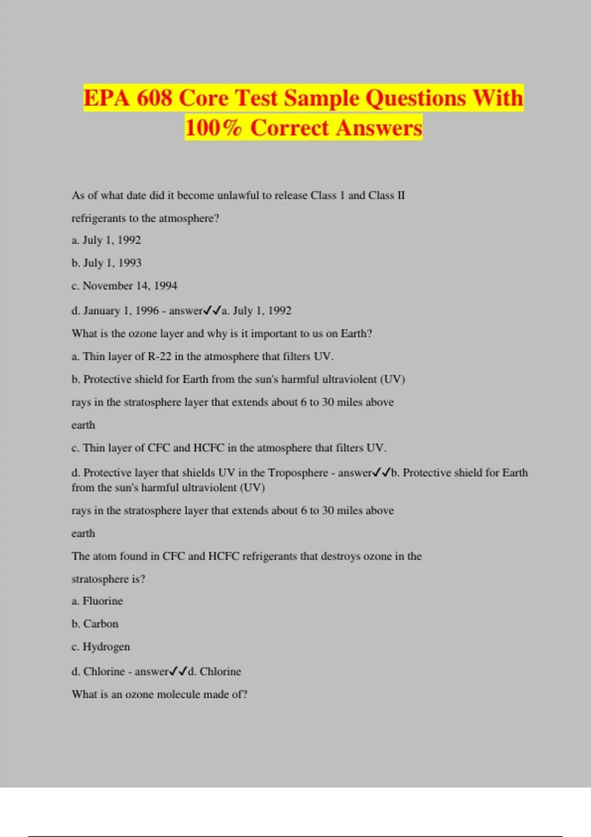 EPA 608 Core Test Sample Questions With 100% Correct Answers As of what date did it become unlawful to release Class 1 and Class II refrigerants to the atmosphere? a. July 1, 1992 b. July 1, 1993 c. November 14, 1994 d. January 1, 1996 - answera. July 1, 1992 What is the ozone layer and why is it important to us on Earth? a. Thin layer of R-22 in the atmosphere that filters UV. b. Protective shield for Earth from the sun's harmful ultraviolent (UV) rays in the stratosphere layer that extends about 6 to 30 miles above earth c. Thin layer of CFC and HCFC in the atmosphere that filters UV. d. Protective layer that shields UV in the Troposphere - answerb. Protective shield for Earth from the sun's harmful ultraviolent (UV) rays in the stratosphere layer that extends about 6 to 30 miles above earth The atom found in CFC and HCFC refrigerants that destroys ozone in the stratosphere is? a. Fluorine b. Carbon c. Hydrogen d. Chlorine - answerd. Chlorine What is an ozone molecule made of? a. Refrigerant b. Ammonia c. Three oxygen atoms (O3). d. Oxygen and ammonia. - answerThree oxygen atoms (O3). Which refrigerant is a CFC? a. R-134A b. R-123 c. R-22 d. R-12 - answerd. R-12 What is the name of the atom that attacks ozone molecules? a. CFC atoms b. HCFC atoms c. Chlorine and bromine atoms emitted into the atmosphere d. a and b - answerc. Chlorine and bromine atoms emitted into the atmosphere Which refrigerant is a HFC? a. R-134A b. R-123 c. R-22 d. R-12 - answera. R-134A Describe how one Chlorine atom can destroy 100,000 ozone molecules. a. Chlorine releases one of the oxygen atoms and forms two O2 oxygen molecules, leaving the chlorine molecule free to attack another ozone molecule and repeat the process. b. Chlorine locks up the ozone molecule and then and then goes after another. c. Chlorine converts the ozone to bromine and then attacks more ozone molecules. d. Chlorine can bleach 100,000 ozone molecules before it weakens. - answera. Chlorine releases one of the oxygen atoms and forms two O2 oxygen molecules, leaving the chlorine molecule free to attack another ozone molecule and repeat the process. Which refrigerant contains no chlorine? a. R-134A b. R-123 c. R-22 d. R-12 - answera. R-134A Name the refrigerant types that belong to CFCs, HCFCs and HFCs a. CFC R-11, R-12, R-500 b. HCFC R-22, R-123 c. HFC R-134a d. All of the above are correct - answerd. All of the above are correct The rule of thumb for refilling approved cylinders is a maximum of ___ percent liquid? a. 60% b. 79% c. 80% d. 90% - answerc. 80% What do the letters in "HCFC" stand for? a. High Carbon Fluorine Chlorine b. hydrochlorofluorocarbons c. Harmful Carbon Fluorine Chlorine d. highchlorinefluorocarbon - answerb. hydrochlorofluorocarbons To recover refrigerant is to? a. Remove a refrigerant in any co