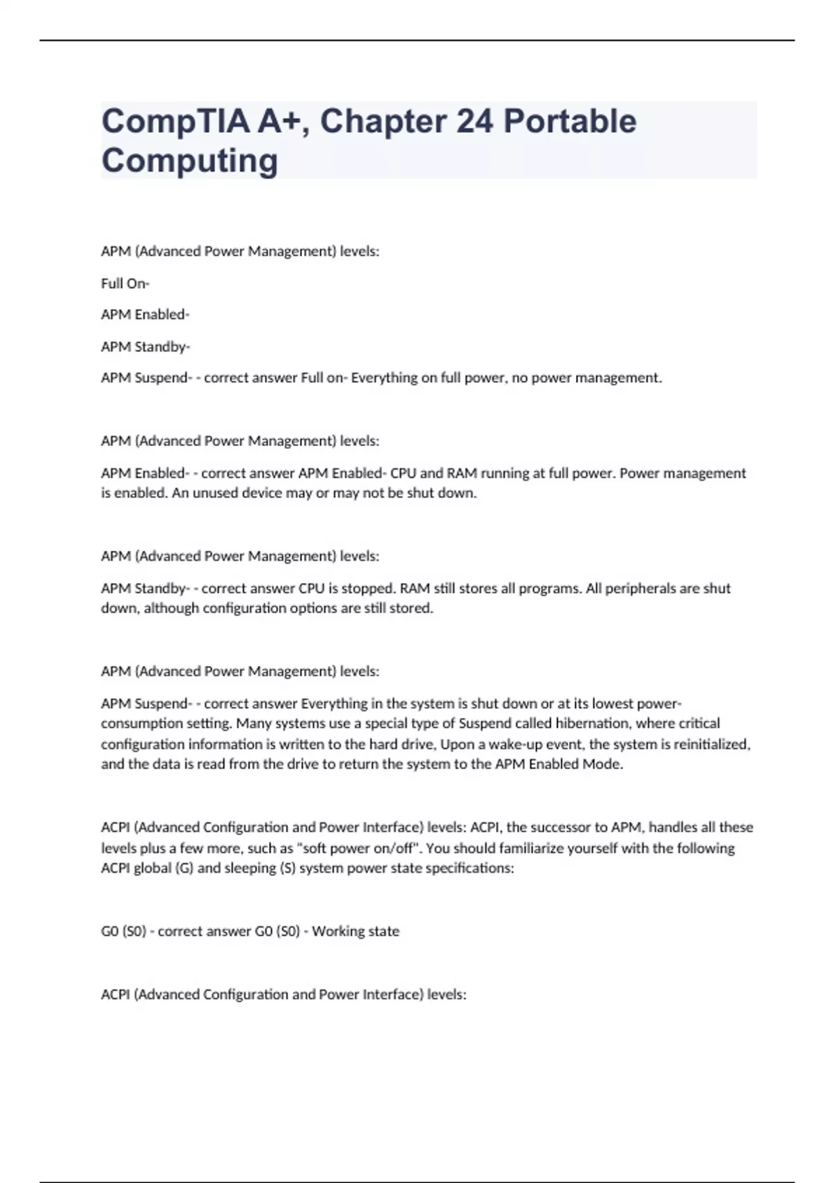 CompTIA A+, Chapter 24 Portable Computing Question and answers 2023/2024 verified to passAPM (Advanced Power Management) levels: Full On- APM Enabled- APM Standby- APM Suspend- - correct answer Full on- Everything on full power, no power management. APM (Advanced Power Management) levels: APM Enabled- - correct answer APM Enabled- CPU and RAM running at full power. Power management is enabled. An unused device may or may not be shut down. APM (Advanced Power Management) levels: APM Standby- - correct answer CPU is stopped. RAM still stores all programs. All peripherals are shut down, although configuration options are still stored. APM (Advanced Power Management) levels: APM Suspend- - correct answer Everything in the system is shut down or at its lowest power-consumption setting. Many systems use a special type of Suspend called hibernation, where critical configuration information is written to the hard drive, Upon a wake-up event, the system is reinitialized, and the data is read from the drive to return the system to the APM Enabled Mode. ACPI (Advanced Configuration and Power Interface) levels: ACPI, the successor to APM, handles all these levels plus a few more, such as "soft power on/off". You should familiarize yourself with the following ACPI global (G) and sleeping (S) system power state specifications: G0 (S0) - correct answer G0 (S0) - Working state ACPI (Advanced Configuration and Power Interface) levels: G1 - - correct answer G1 - Sleeping st