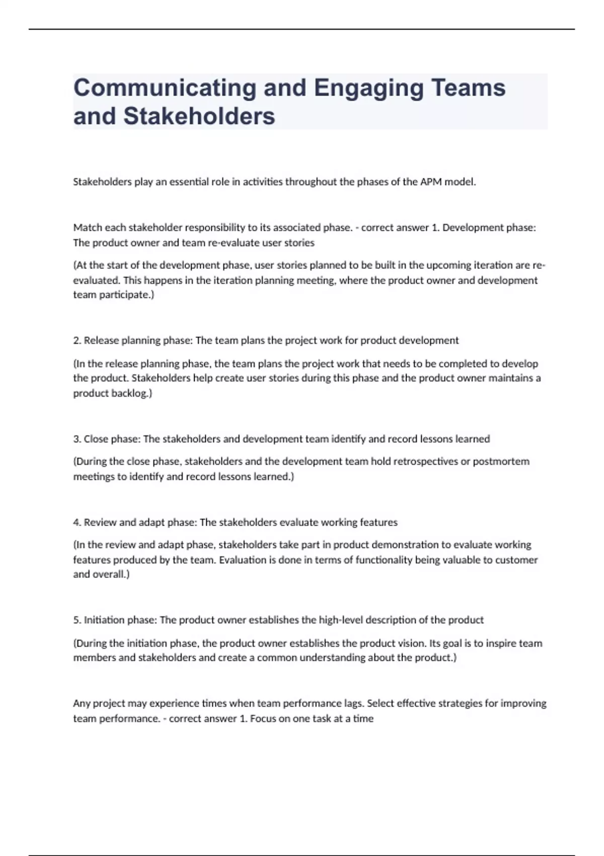 Communicating and Engaging Teams and Stakeholders Question and answers correctly solved 2023/2024 Stakeholders play an essential role in activities throughout the phases of the APM model. Match each stakeholder responsibility to its associated phase. - correct answer 1. Development phase: The product owner and team re-evaluate user stories (At the start of the development phase, user stories planned to be built in the upcoming iteration are re-evaluated. This happens in the iteration planning meeting, where the product owner and development team participate.) 2. Release planning phase: The team plans the project work for product development (In the release planning phase, the team plans the project work that needs to be completed to develop the product. Stakeholders help create user stories during this phase and the product owner maintains a product backlog.) 3. Close phase: The stakeholders and development team identify and record lessons learned (During the close phase, stakeholders and the development team hold retrospectives or postmortem meetings to identify and record lessons learned.) 4. Review and adapt phase: The stakeholders evaluate working features (In the review and adapt phase, stakeholders take part in product demonstration to evaluate working features produced by the
