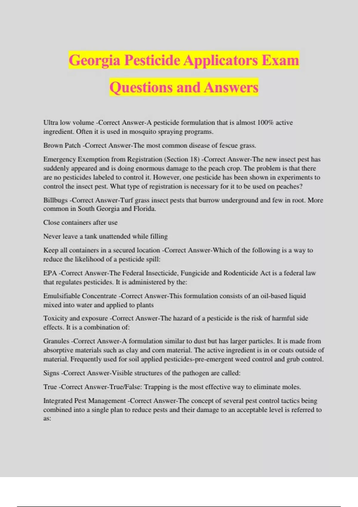 Georgia Pesticide Applicators Exam Questions and Answers Ultra low volume -Correct Answer-A pesticide formulation that is almost 100% active ingredient. Often it is used in mosquito spraying programs. Brown Patch -Correct Answer-The most common disease of fescue grass. Emergency Exemption from Registration (Section 18) -Correct Answer-The new insect pest has suddenly appeared and is doing enormous damage to the peach crop. The problem is that there are no pesticides labeled to control it. However, one pesticide has been shown in experiments to control the insect pest. What type of registration is necessary for it to be used on peaches? Billbugs -Correct Answer-Turf grass insect pests that burrow underground and few in root. More common in South Georgia and Florida. Close containers after use Never leave a tank unattended while filling Keep all containers in a secured location -Correct Answer-Which of the following is a way to reduce the likelihood of a pesticide spill: EPA -Correct Answer-The Federal Insecticide, Fungicide and Rodenticide Act is a federal law that regulates pesticides. It is administered by the: Emulsifiable Concentrate -Correct Answer-This formulation consists of an oil-based liquid mixed into water and applied to plants Toxicity and exposure -Correct Answer-The hazard of a pesticide is the risk of harmful side effects. It is a combination of: Granules -Correct Answer-A formulation similar to dust but has larger particles. It is made from absorptive materials such as clay and corn material. The active ingredient is in or coats outside of material. Frequently used for soil applied pesticides-pre-emergent weed control and grub control. Signs -Correct Answer-Visible structures of the pathogen are called: True -Correct Answer-True/False: Trapping is the most effective way to eliminate moles. Integrated Pest Management -Correct Answer-The concept of several pest control tactics being combined into a single plan to reduce pests and their damage to an acceptable level is referred to as: Chemical resistance -Correct Answer-The property that prevents pesticide movement through the material during use is called: Residue -Correct Answer-The part of the pesticide that remains in the environment and on plant or other material for a period of time following the application. Worker Protection Standard -Correct Answer-Employers must provide agricultural workers and pesticide handlers with protection against possible pesticide harm. This is in compliance with: Bacterial Leaf Spots -Correct Answer-The formation of dark green to brown water-soaked spots form on the leaves sometimes accompanied by a yellow halo is indicative of: Threshold -Correct Answer-When the pest population reaches a level at which control is necessary to prevent unacceptable damage or i