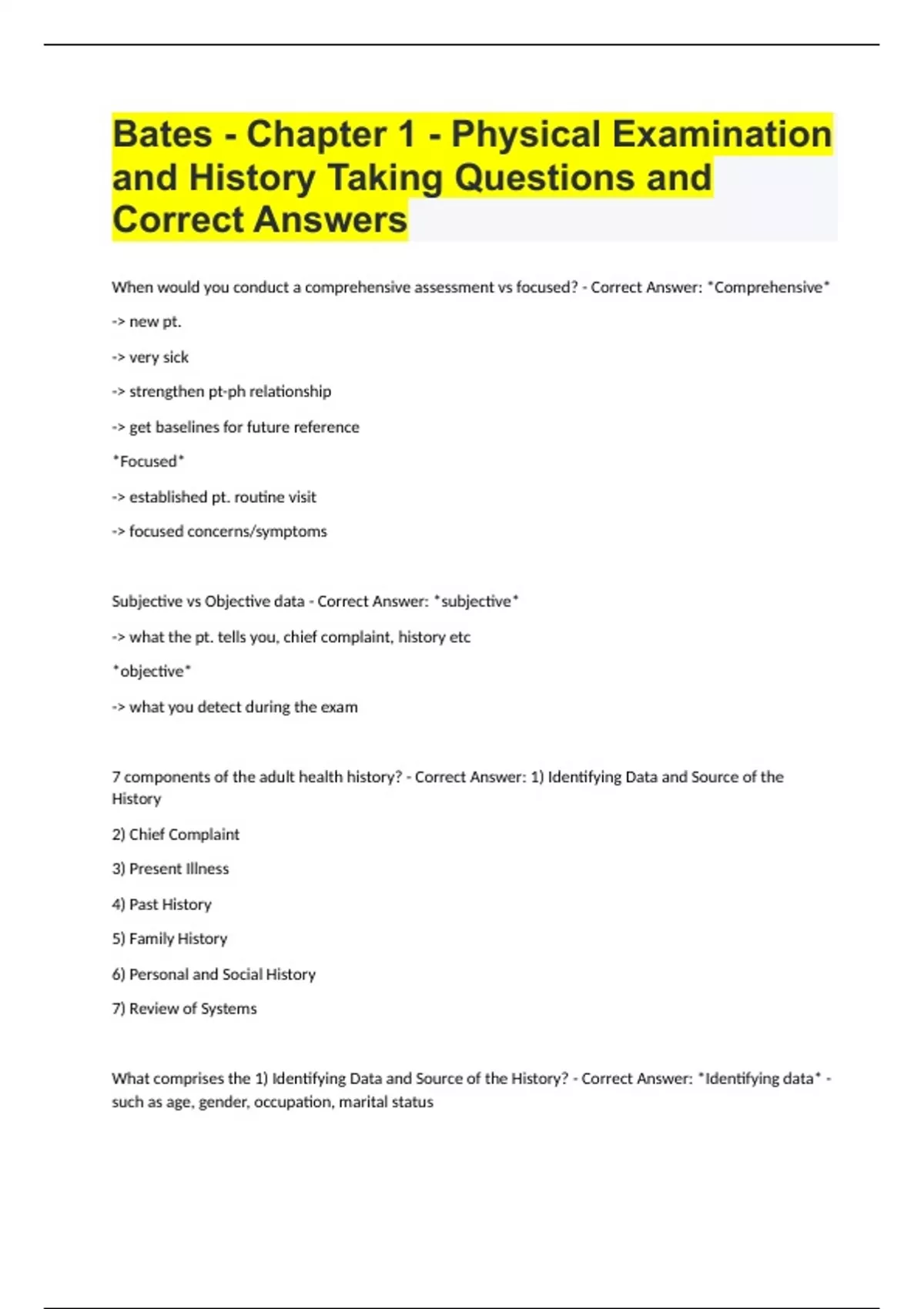 Bates - Chapter 1 - Physical Examination and History Taking Questions and Correct Answers
