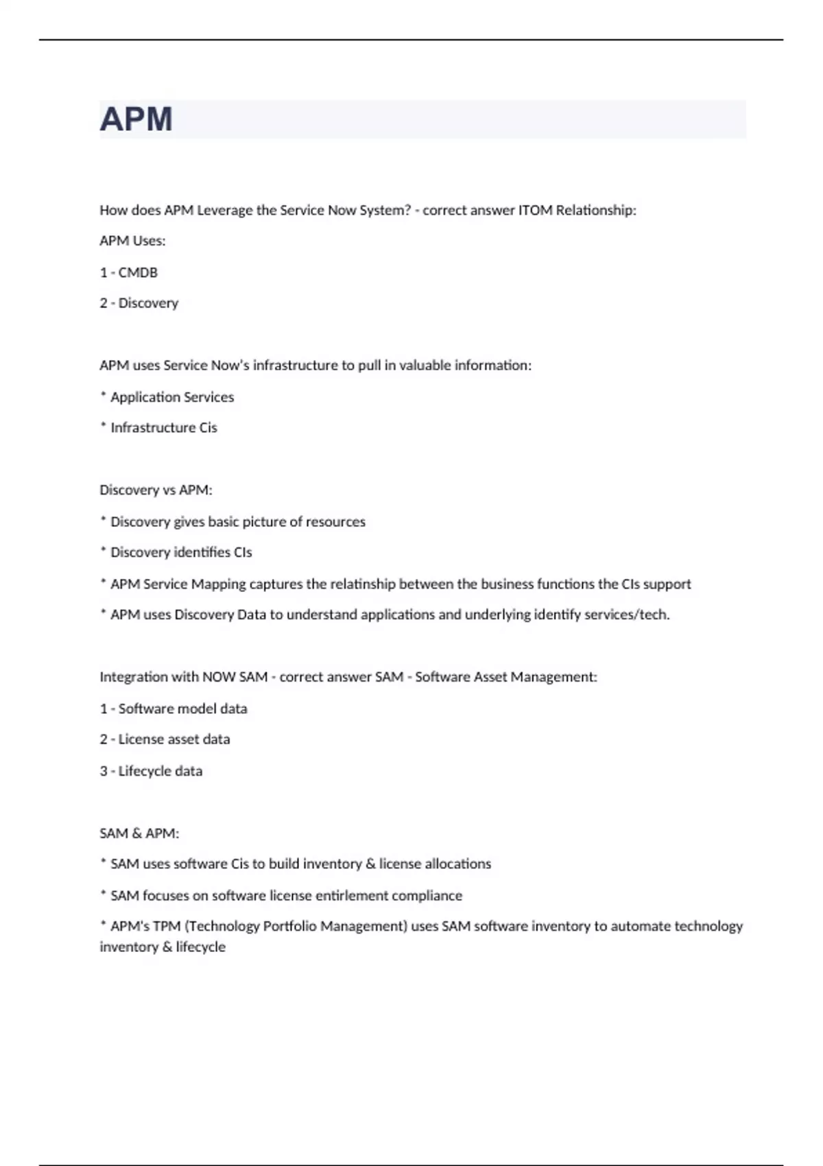 APM Question and answers already passed 2023/2024 How does APM Leverage the Service Now System? - correct answer ITOM Relationship: APM Uses: 1 - CMDB 2 - Discovery APM uses Service Now’s infrastructure to pull in valuable information: * Application Services * Infrastructure Cis Discovery vs APM: * Discovery gives basic picture of resources * Discovery identifies CIs * APM Service Mapping captures the relatinship between the business functions the CIs support * APM uses Discovery Data to understand applications and underlying identify services/tech. Integration with NOW SAM - correct answer SAM - Software Asset Management: 1 - Software model data 2 - License asset data 3 - Lifecycle data