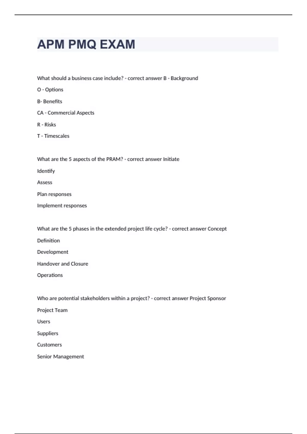 APM PMQ EXAM Question and answers already passed 2023/2024 What should a business case include? - correct answer B - Background O - Options B- Benefits CA - Commercial Aspects R - Risks T - Timescales What are the 5 aspects of the PRAM? - correct answer Initiate Identify Assess Plan responses Implement responses What are the 5 phases in the extended project life cycle? - correct answer Concept Definition Development Handover and Closure Operations Who are potential stakeholders within a project? - correct answer Project Sponsor Project Team Users Suppliers Customers Senior Management