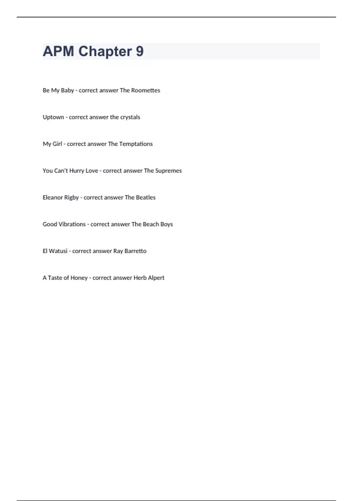 APM Chapter 9 Question and answers correctly solved 2023/2024Be My Baby - correct answer The Roomettes Uptown - correct answer the crystals My Girl - correct answer The Temptations You Can't Hurry Love - correct answer The Supremes Eleanor Rigby - correct answer The Beatles Good Vibrations - correct answer The Beach Boys El Watusi - correct answer R