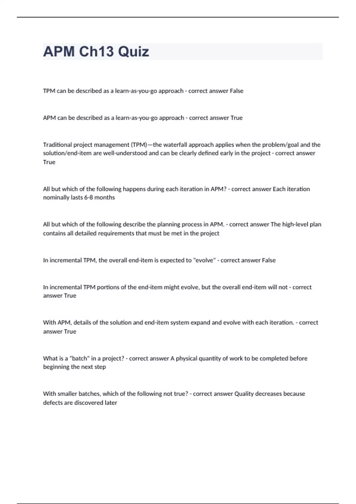 APM Ch13 Quiz Question and answers already passed 2023/2024 TPM can be described as a learn-as-you-go approach - correct answer False APM can be described as a learn-as-you-go approach - correct answer True Traditional project management (TPM)—the waterfall approach applies when the problem/goal and the solution/end-item are well-understood and can be clearly defined early in the project - correct answer True All but which of the following happens during each iteration in APM? - correct answer Each iteration nominally lasts 6-8 months All but which of the following describe the planning process in APM. - correct answer The high-level plan contains all detailed requirements that must be met in the project In incremental TPM, the overall end-item is expected to "evolve" - correct answer False In incremental TPM portions of the end-item might evolve, but the overall end-item will not - correct answer True With APM, details of the solution and end-item system expand and evolve with each iteration. - correct answer True