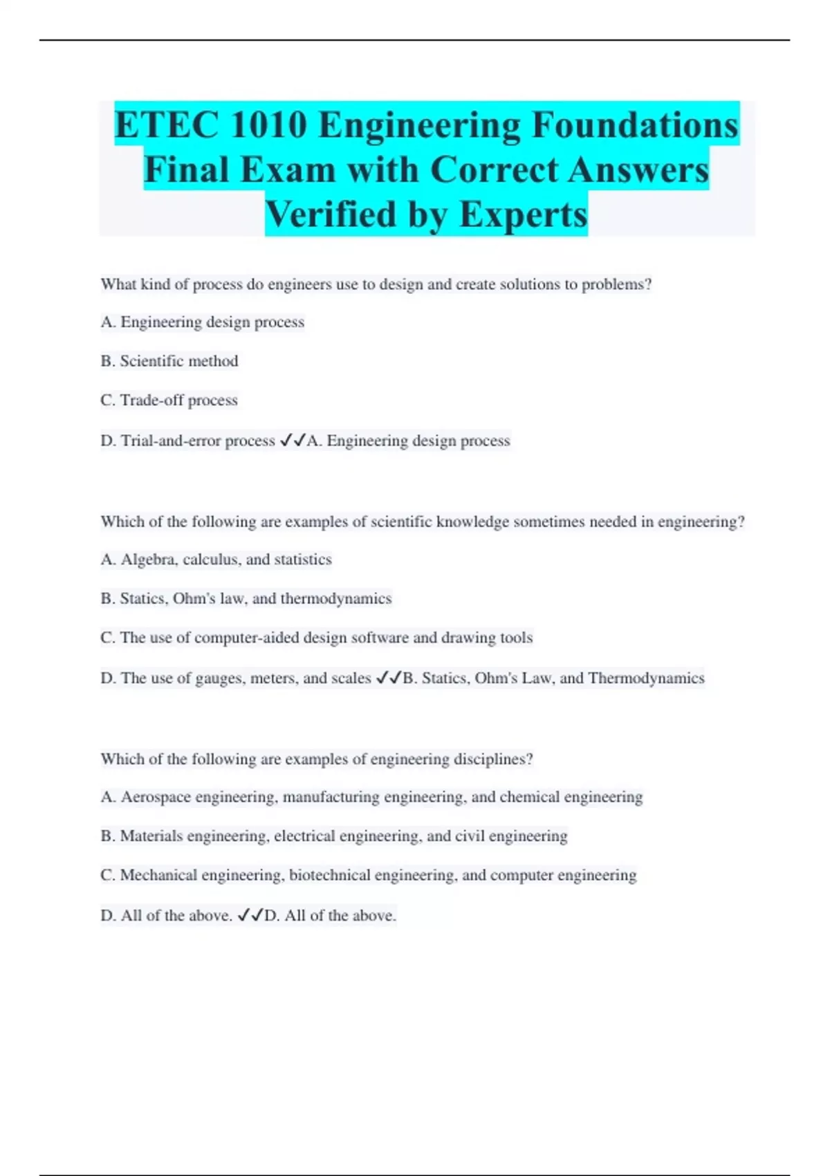 ETEC 1010 Engineering Foundations Final Exam with Correct Answers Verified by Experts What kind of process do engineers use to design and create solutions to problems? A. Engineering design process B. Scientific method C. Trade-off process D. Trial-and-error process A. Engineering design process Which of the following are examples of scientific knowledge sometimes needed in engineering? A. Algebra, calculus, and statistics B. Statics, Ohm's law, and thermodynamics C. The use of computer-aided design software and drawing tools D. The use of gauges, meters, and scales B. Statics, Ohm's Law, and Thermodynamics Which of the following are examples of engineering disciplines? A. Aerospace engineering, manufacturing engineering, and chemical engineering B. Materials engineering, electrical engineering, and civil engineering C. Mechanical engineering, biotechnical engineering, and computer engineering D. All of the above. D. All of the above