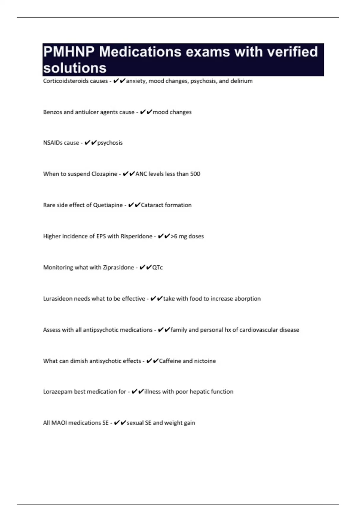 Corticoidsteroids causes - anxiety, mood changes, psychosis, and delirium Benzos and antiulcer agents cause - mood changes NSAIDs cause - psychosis When to suspend Clozapine - ANC levels less than 500 Rare side effect of Quetiapine - Cataract formation Higher incidence of EPS with Risperidone - 6 mg doses Monitoring what with Ziprasidone - QTc Lurasideon needs what to be effective - take with food to increase aborption Assess with all antipsychotic medications - family and personal hx of cardiovascular disease What can dimish antisychotic effects - Caffeine and nictoine Lorazepam best medication for - illness with poor hepatic function All MAOI medications SE - sexual SE and weight gain